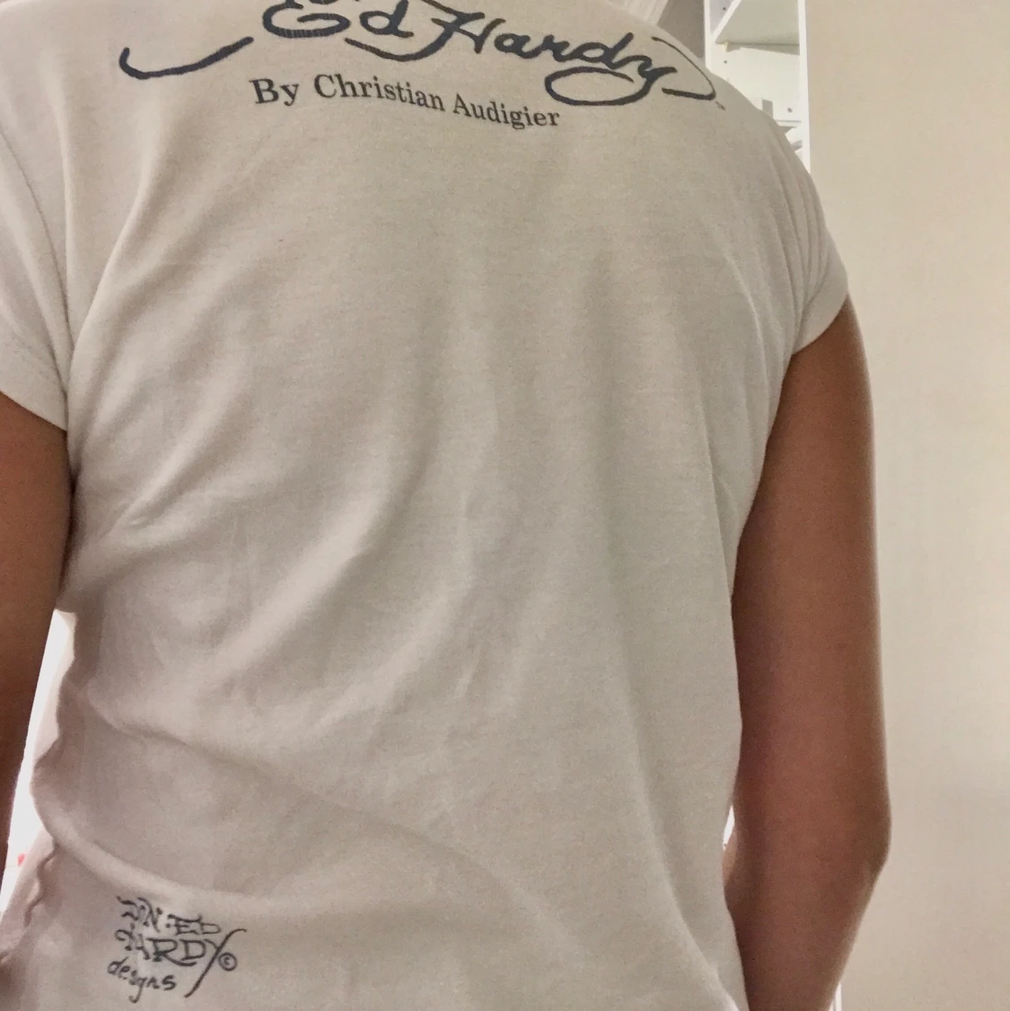 Säljer en cool t-shirt ifrån Ed Hardy som är för liten för mig. Köpt på second hand. Några stenar har ramlat av ifrån trycket på t-shirten men det syns knappt. Frakt tillkommer❤️