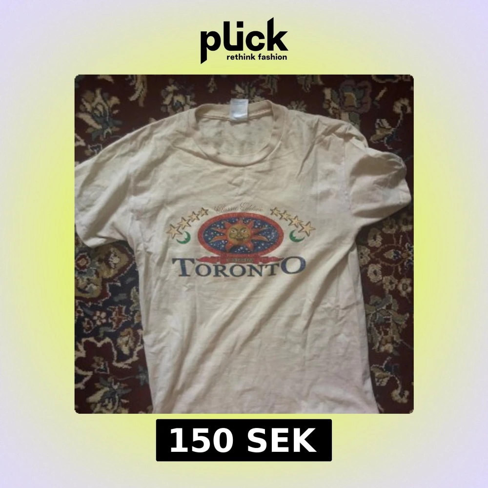 Säljer en beige t-shirt med ett coolt tryck av en sol och texten 'Toronto'. T-shirten har korta ärmar och en rund halsringning. Perfekt för dig som gillar unika tryck och vill ha något annorlunda i garderoben.
