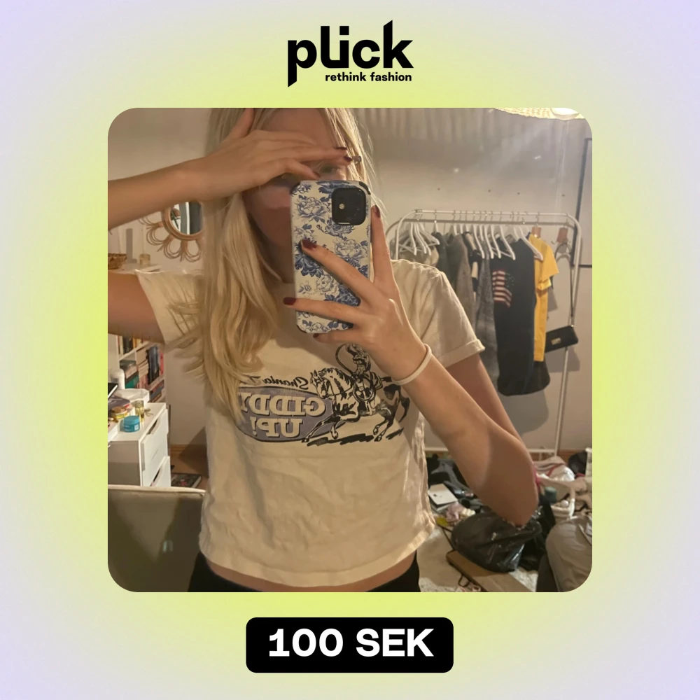 Säljer en cool vit t-shirt med ett unikt cowboytryck och texten 'Giddy Up!'. Den är kortärmad och har en avslappnad passform, perfekt för en casual look. Materialet känns mjukt och bekvämt, idealiskt för sommardagar. Passar bra till jeans eller shorts för en avslappnad stil.