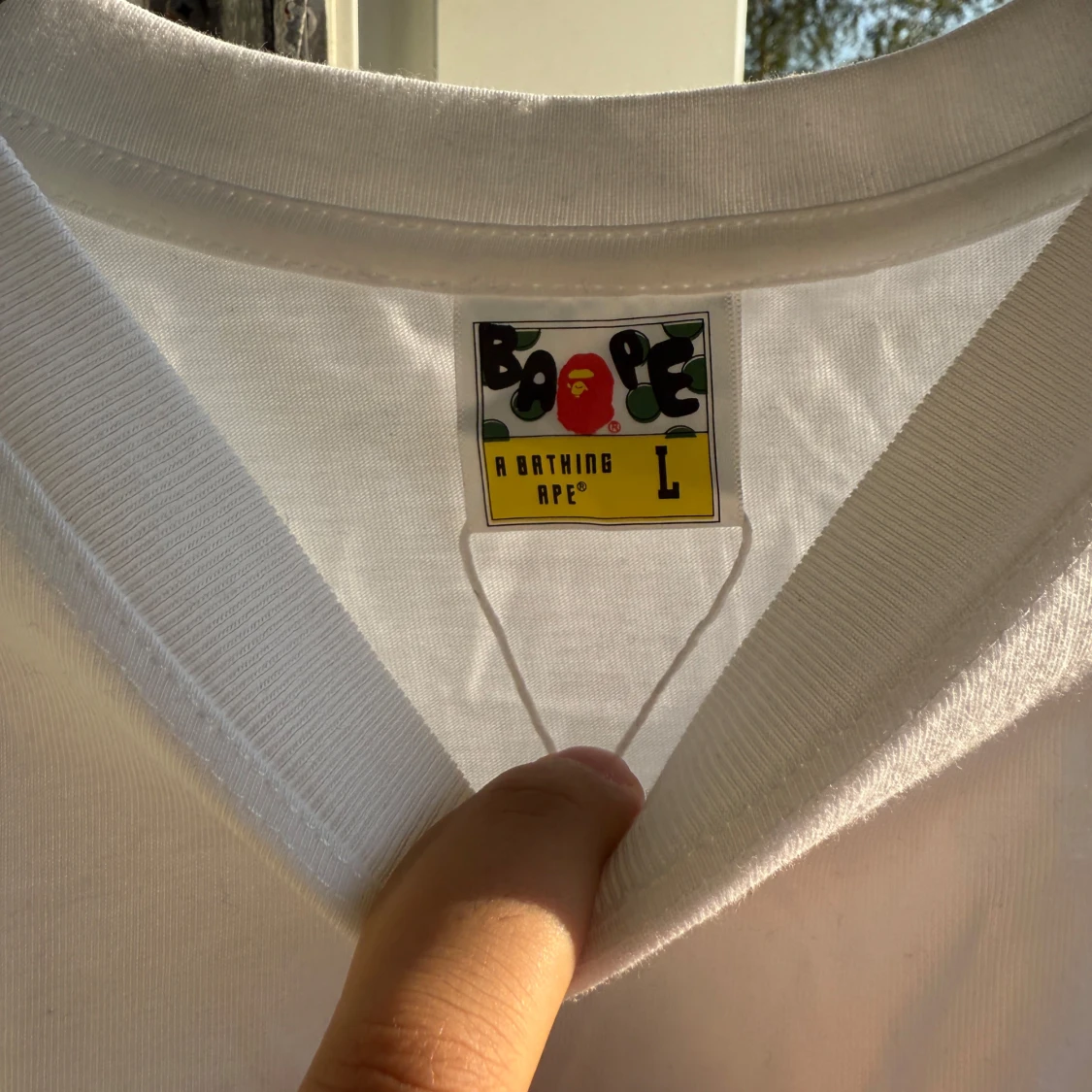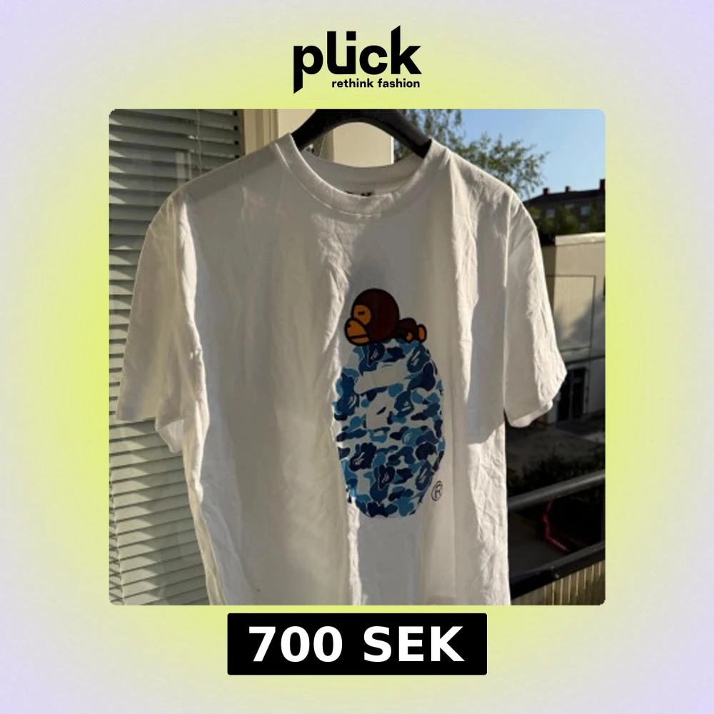 Säljer en clean vit t-shirt från BAPE med ikoniskt blått camo-tryck och en apa på bröstet. Klassisk passform och tillverkad i mjuk bomull. Perfekt för dig som gillar streetwear och vill sticka ut med en unik design.