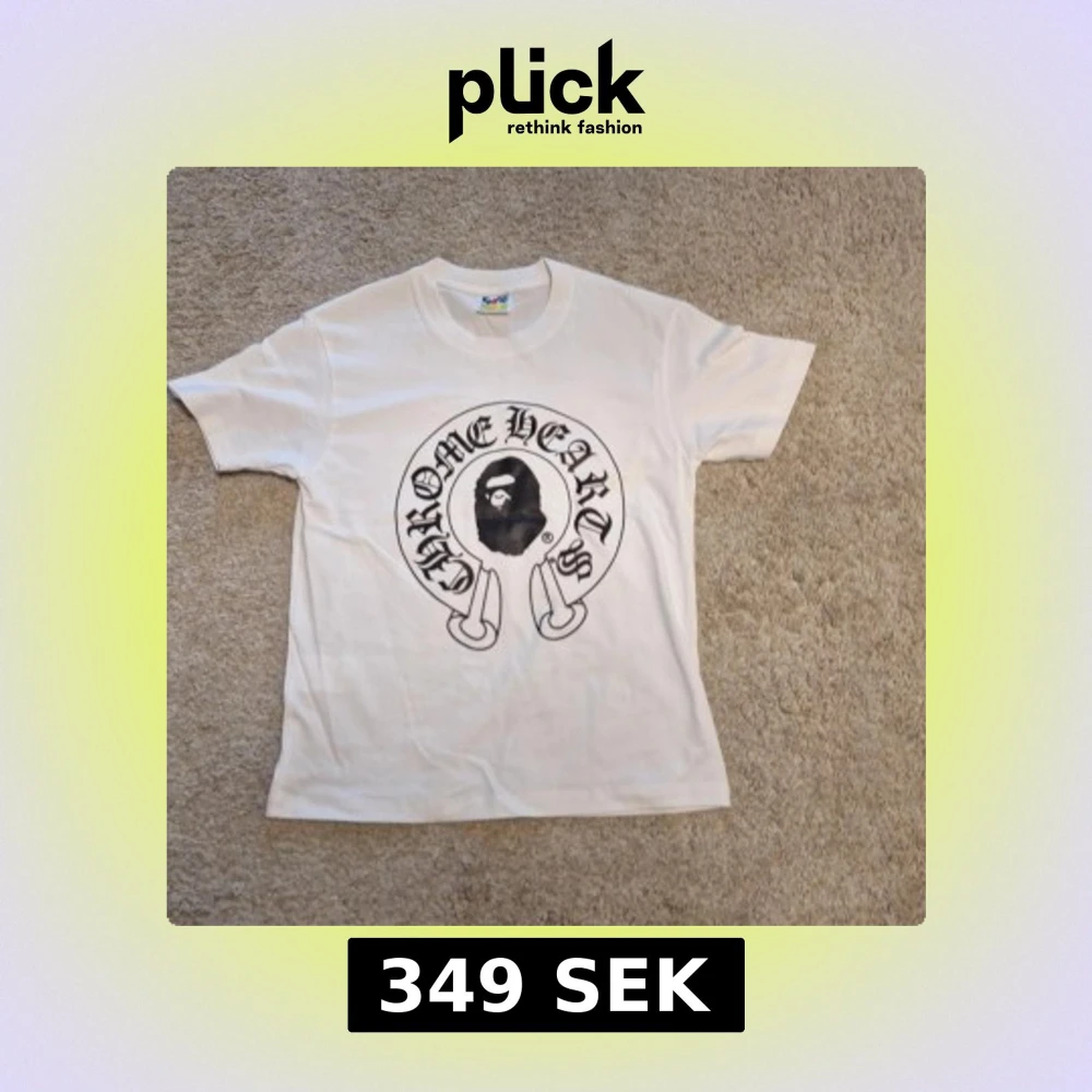 Vit t-shirt från BAPE x Chrome Hearts med stor svart print på både fram- och baksidan. Framsidan har Chrome Hearts-logga och BAPE-ansikte, baksidan har Baby Milo, Chrome Hearts-kors och text. Klassisk rund hals och korta ärmar. Tillverkad i mjuk bomull.