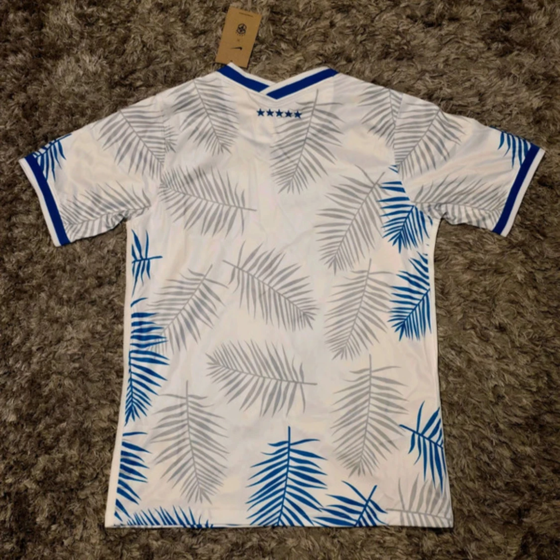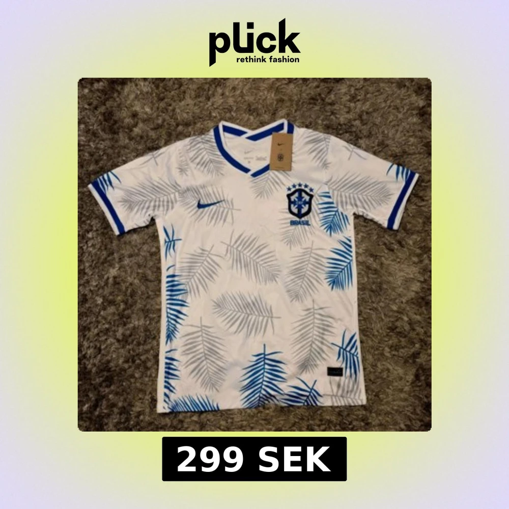 Snygg Brasil fotbollströja från Nike i vit med blå detaljer och palmbladsmönster över hela tröjan. Kortärmad med blått v-ringad krage och blå kant vid ärmslut. Materialet är lätt och andas, perfekt för match eller träning. Brasil-logga och Nike Swoosh på bröstet.