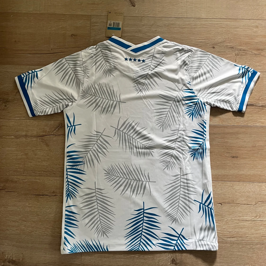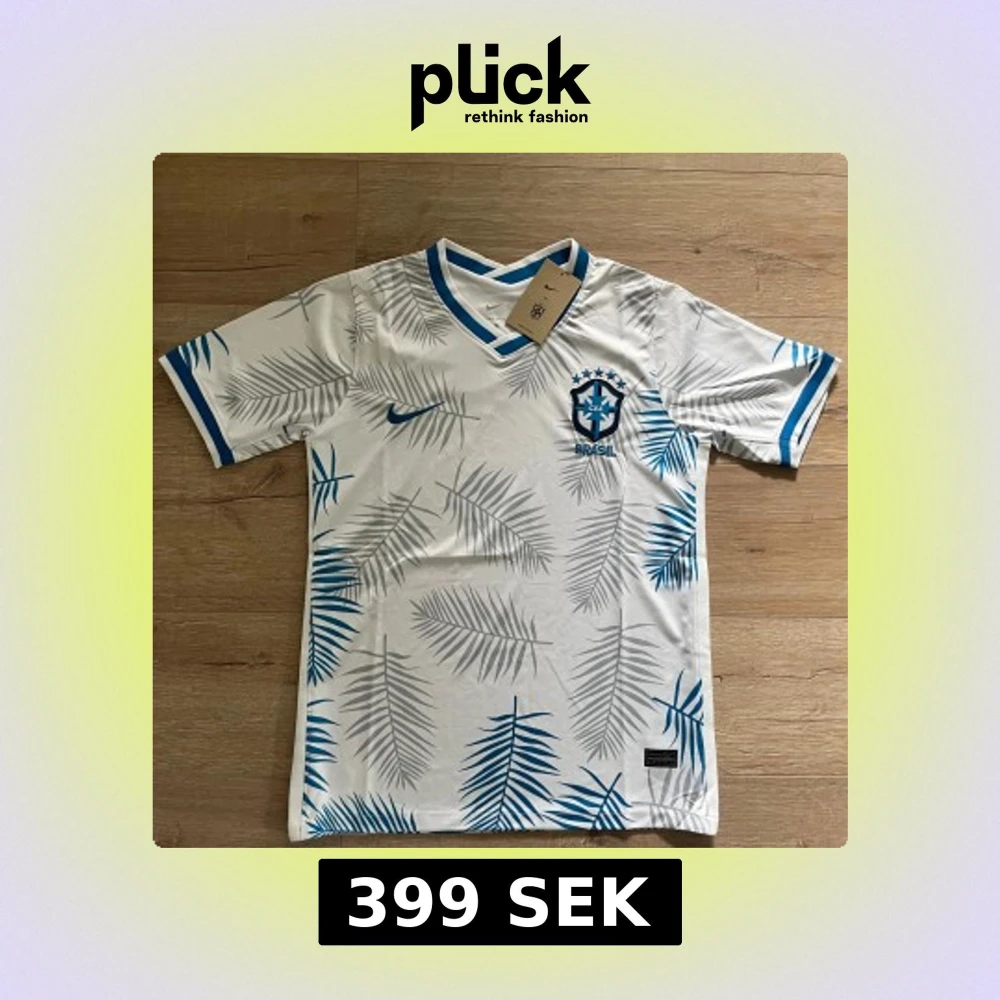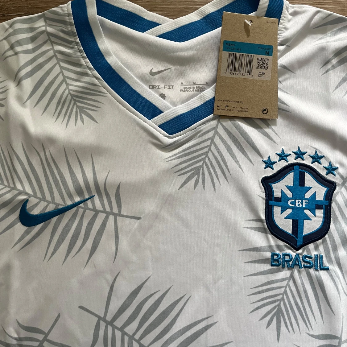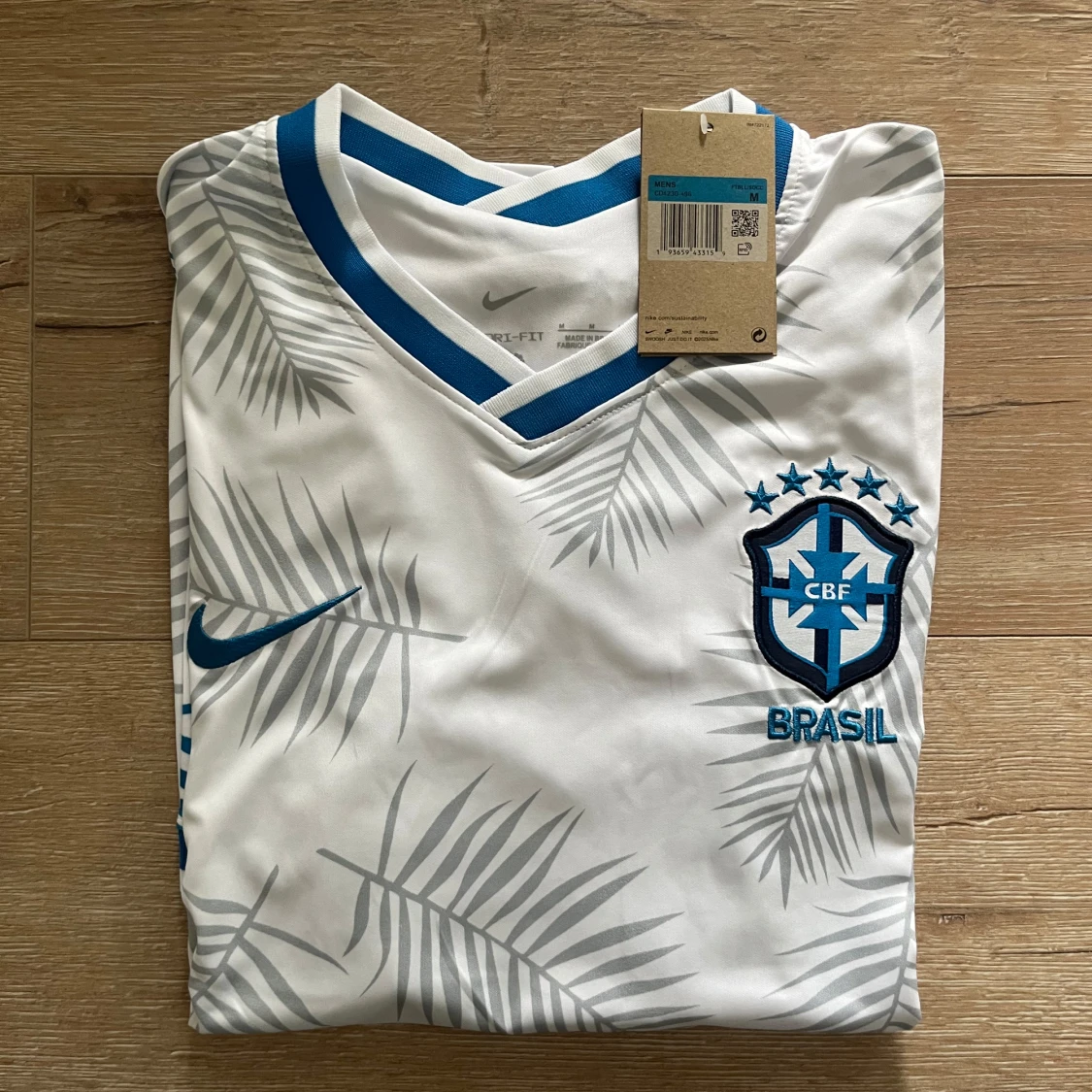 Snygg vit Brasilien fotbollströja från Nike med blå detaljer och grå/blå palmbladsmönster. Tröjan har V-ringning, korta ärmar och broderat CBF-märke på bröstet. Tillverkad i lätt Dri-FIT-material som andas, perfekt för match eller träning.