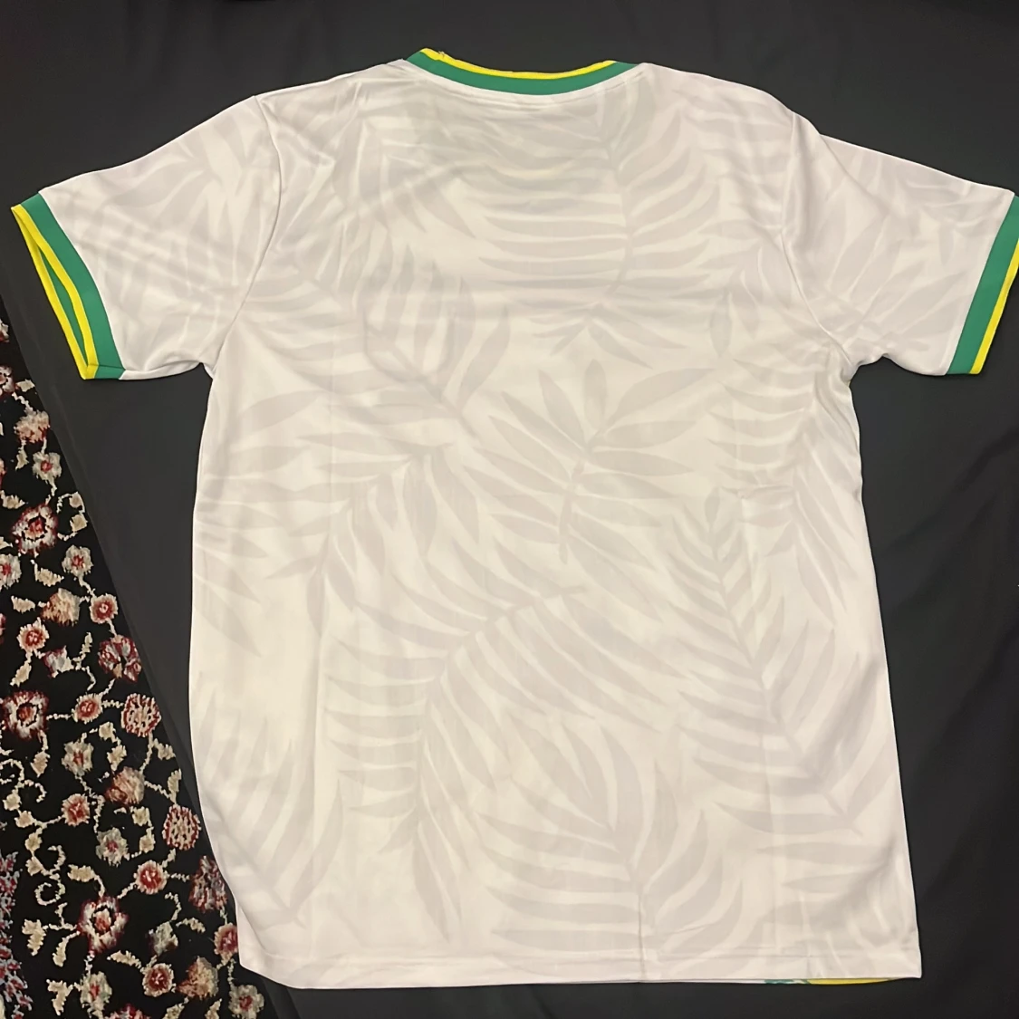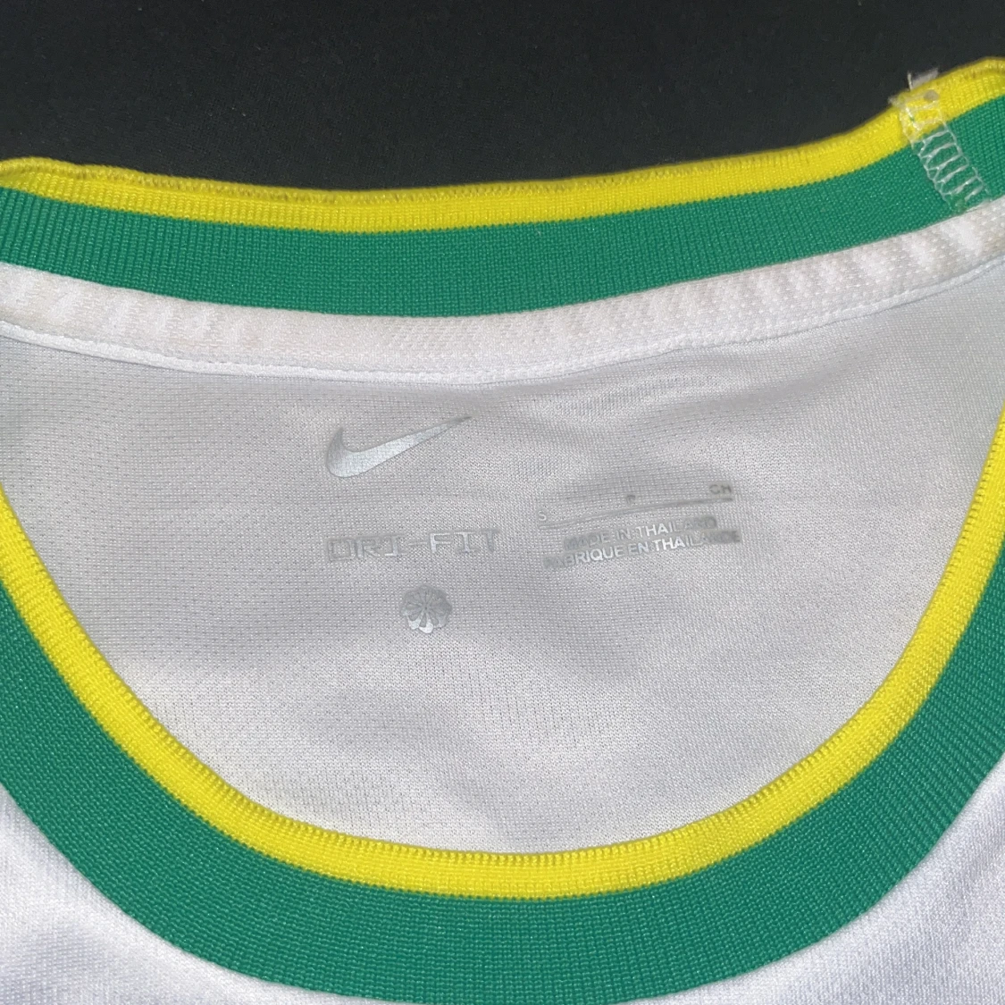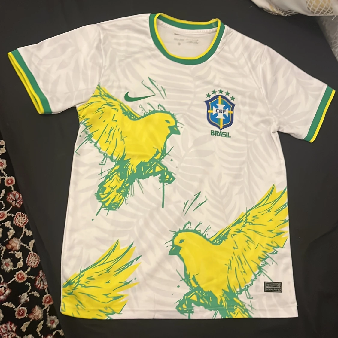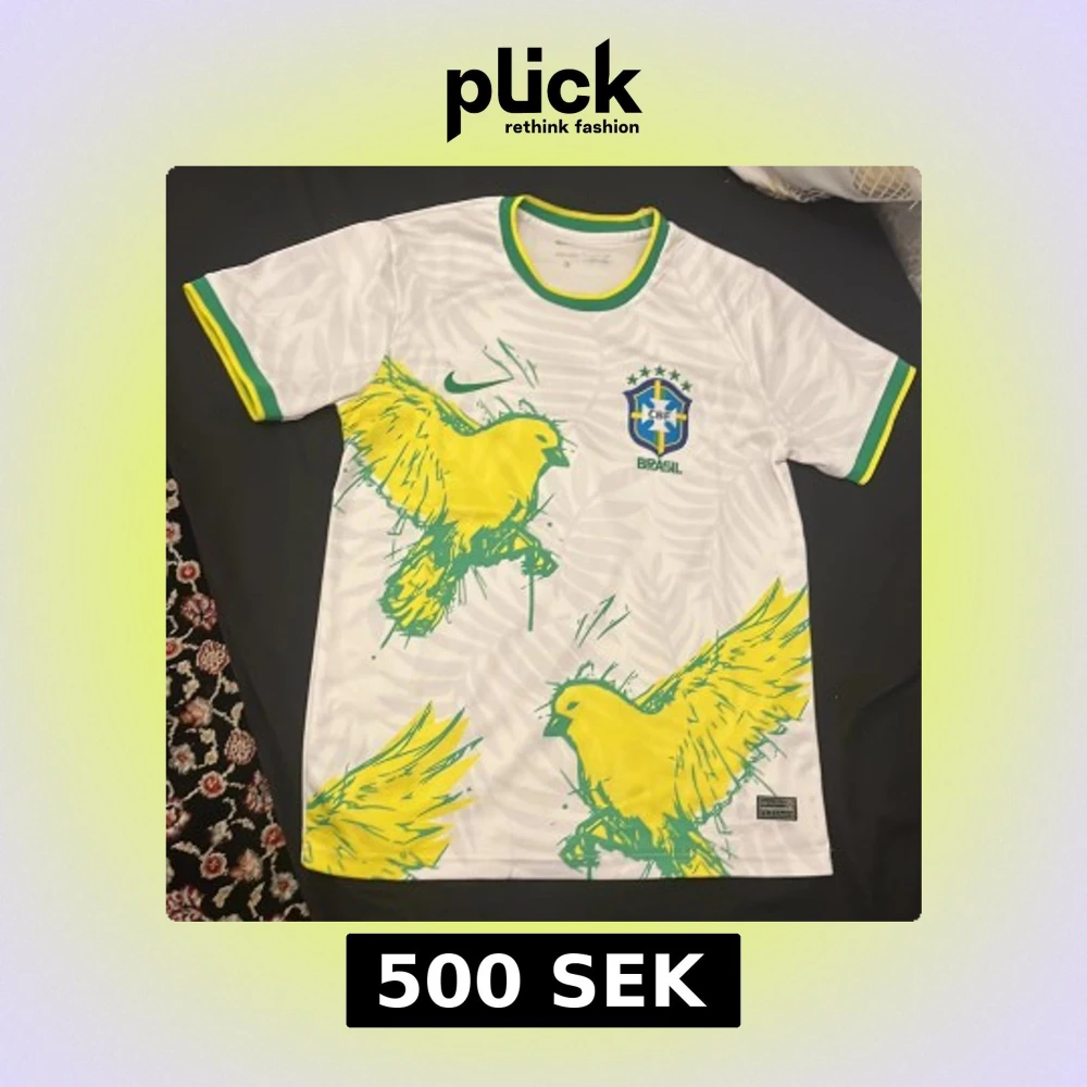 Snygg vit Brasilien fotbollströja från Nike med gröna och gula detaljer. Använt 1 gång. Framsidan har stora gula fåglar och diskret bladmönster i bakgrunden. Broderat Brasilien-emblem och Nike-logga. Tillverkad i Dri-FIT material som andas.