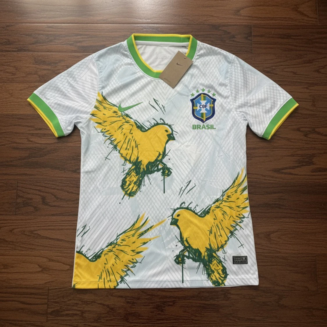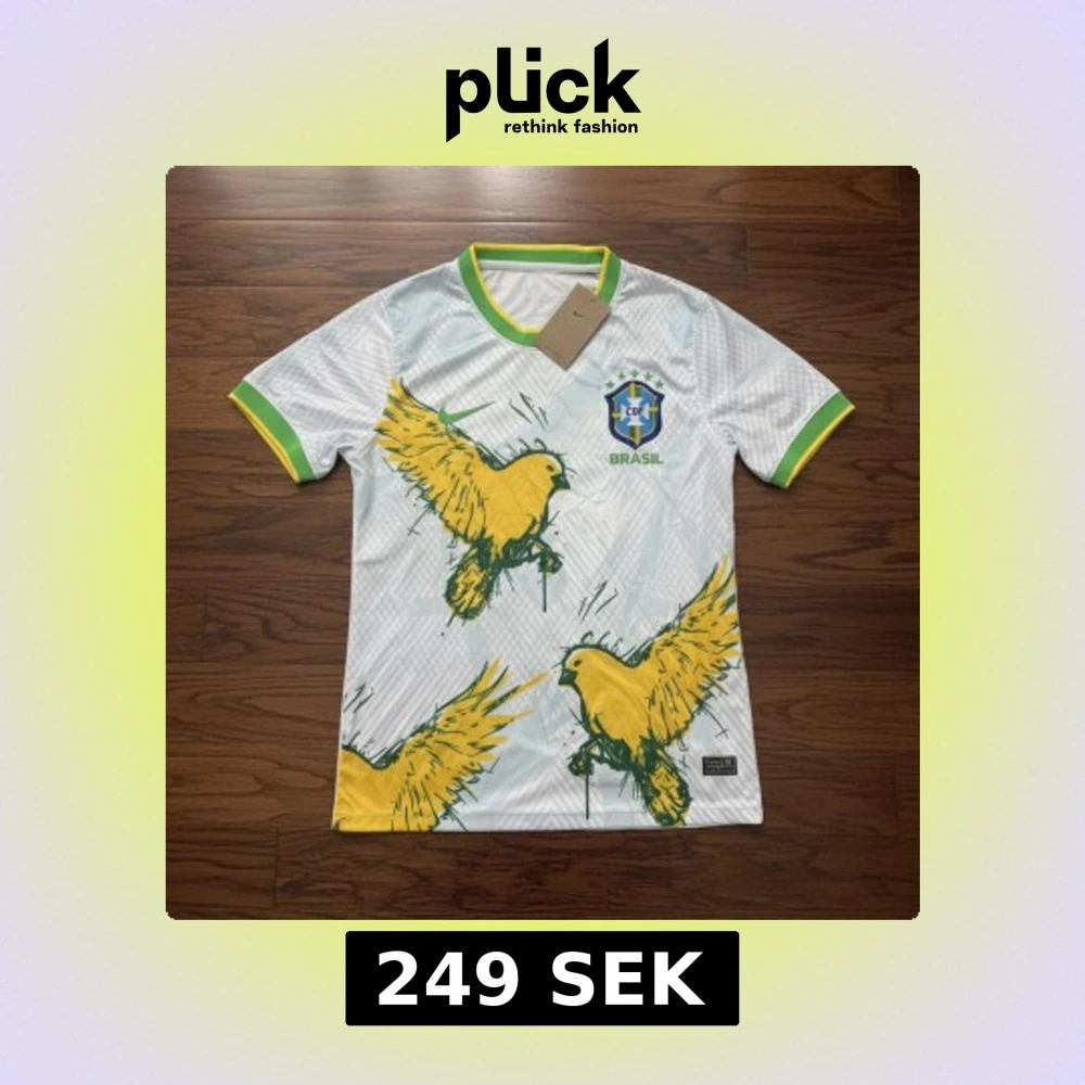 Snygg vit Brasilien fotbollströja från Nike med stora gula fåglar tryckta på framsidan. Tröjan har gröna och gula detaljer vid krage och ärmslut samt Brasilien-emblem på bröstet. Tillverkad i lätt och ventilerande material, perfekt för match eller träning.