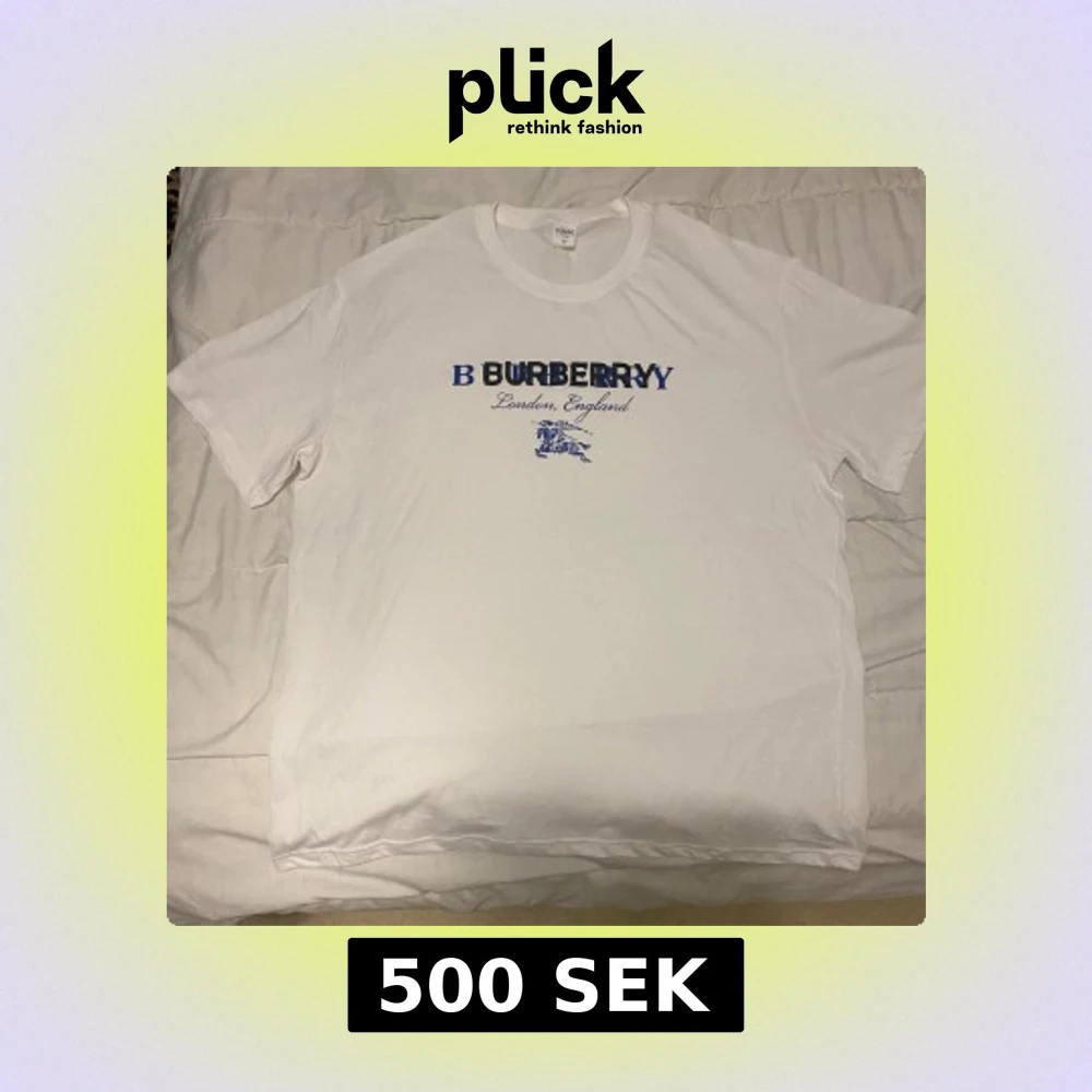 Vit t-shirt från Burberry med blått tryck på bröstet där det står 'Burberry London, England' och en klassisk riddarlogga. T-shirten har rund hals och korta ärmar, perfekt för en clean och stilren look.