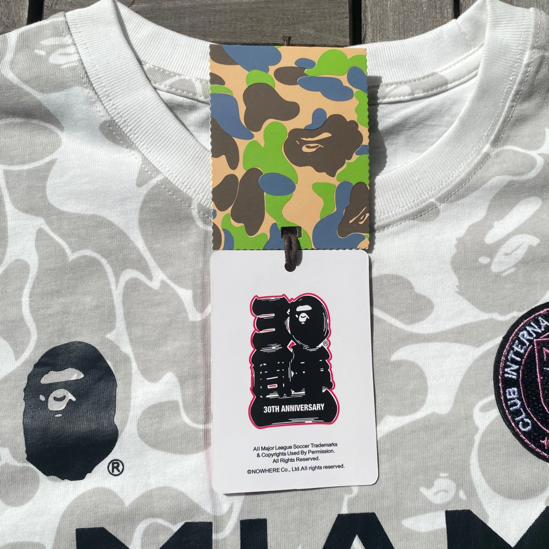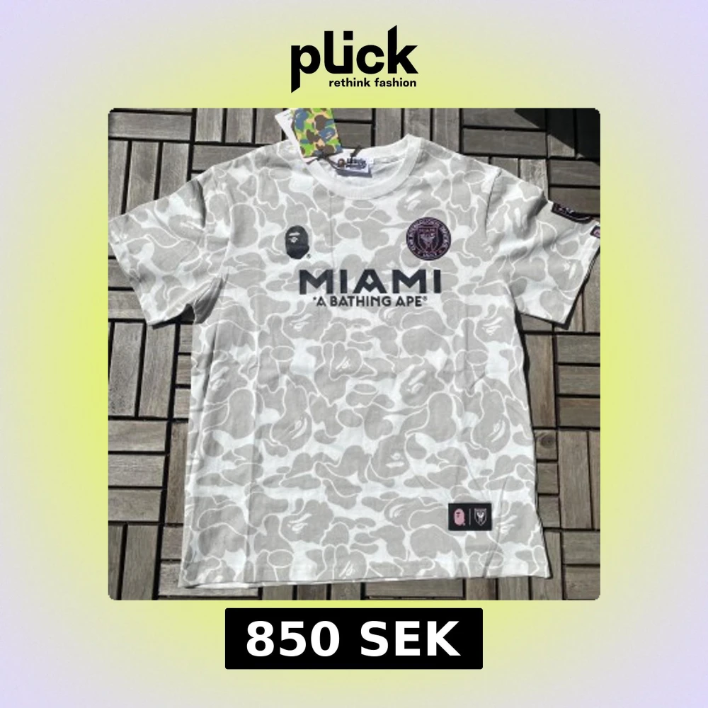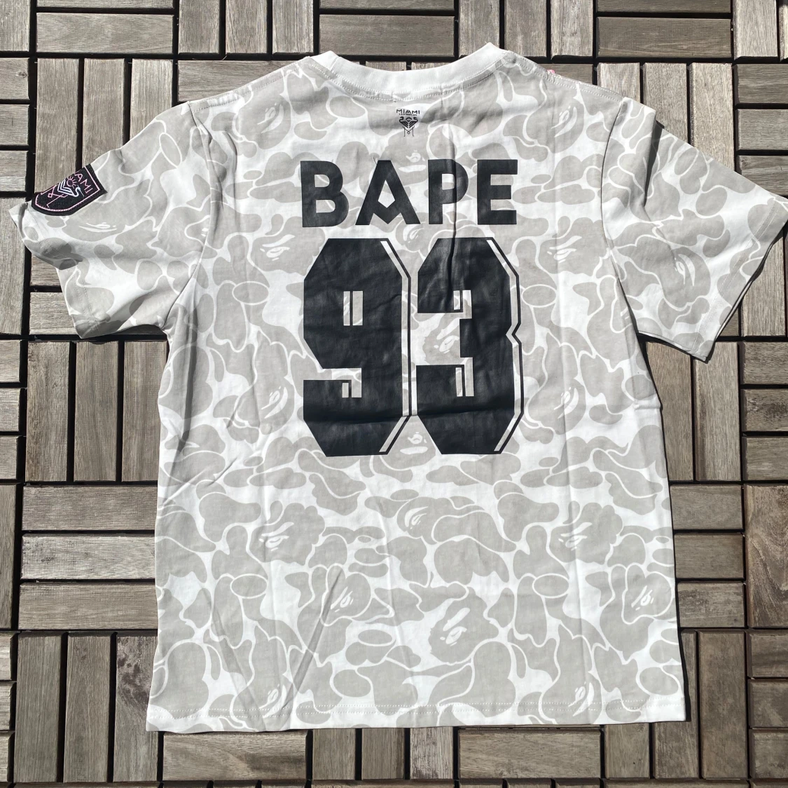 Säljer en vit och ljusgrå camo t-shirt från A Bathing Ape i samarbete med Inter Miami. T-shirten har tryck med MIAMI och BAPE-logga fram, samt stort BAPE 93-tryck bak. Rund hals och kort ärm. Perfekt för dig som gillar streetwear och fotboll. Perfect för sommaren