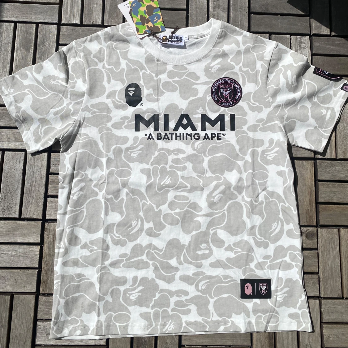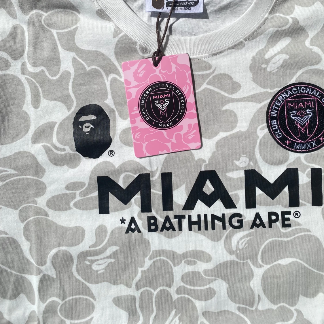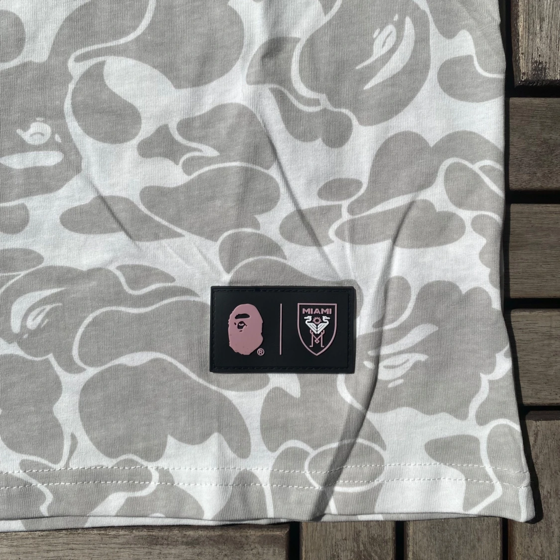 Säljer en vit och ljusgrå camo t-shirt från A Bathing Ape i samarbete med Inter Miami. T-shirten har tryck med MIAMI och BAPE-logga fram, samt stort BAPE 93-tryck bak. Rund hals och kort ärm. Perfekt för dig som gillar streetwear och fotboll. Perfect för sommaren