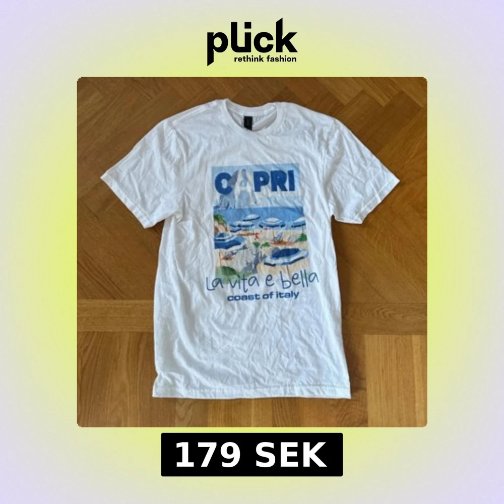Vit t-shirt med färgglatt tryck av Capri och texten 'La vita e bella, coast of Italy'. Motiv med strand, parasoller och hav i blå toner. Klassisk passform och rund halsringning. Perfekt för dig som gillar sommarvibbar och italiensk stil.