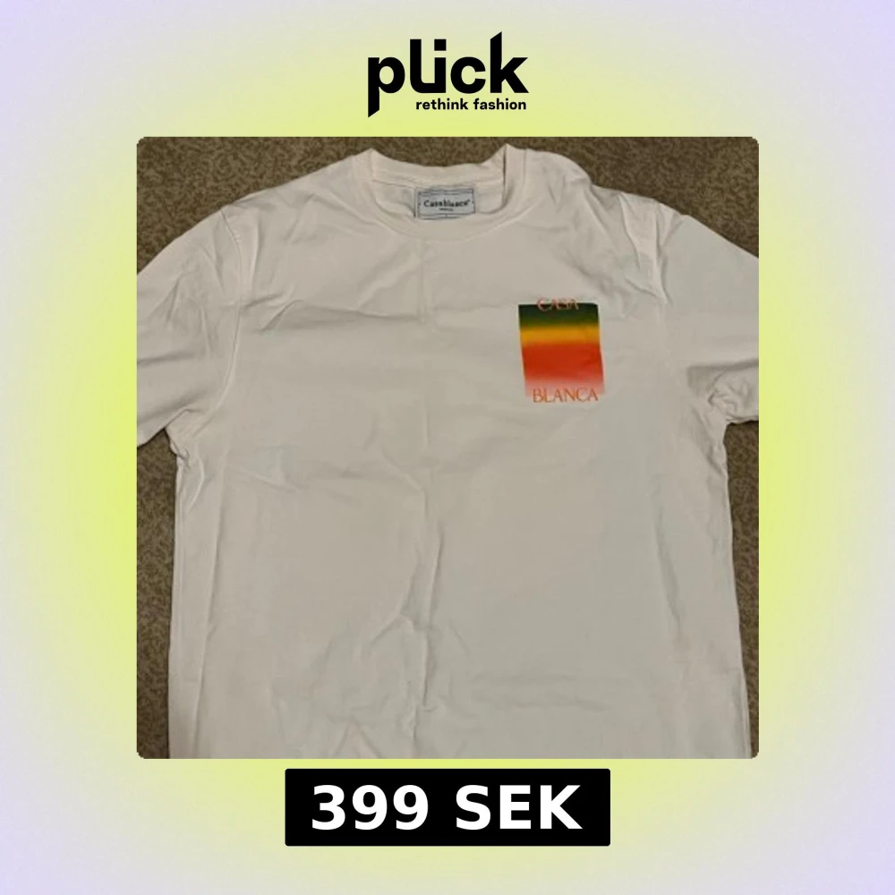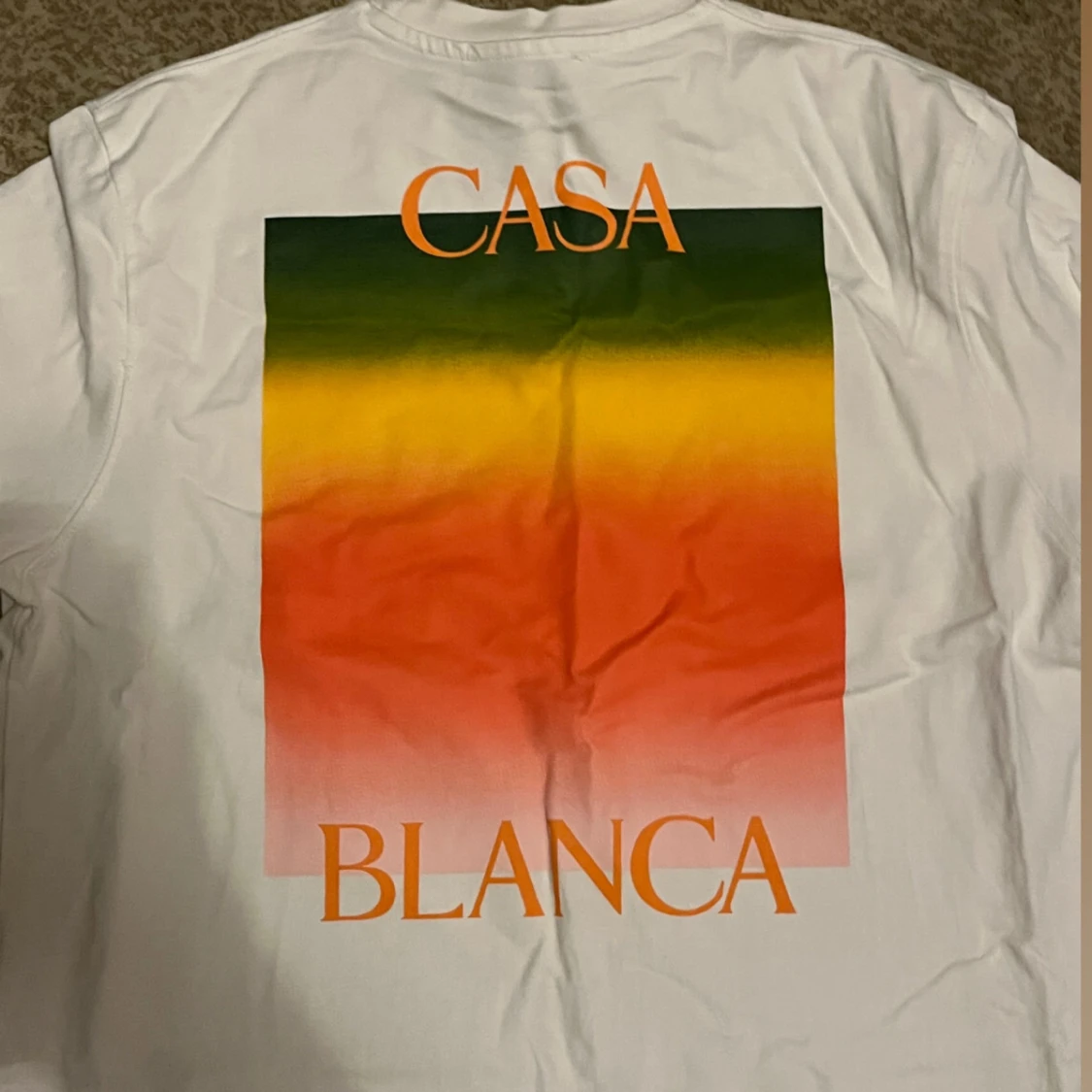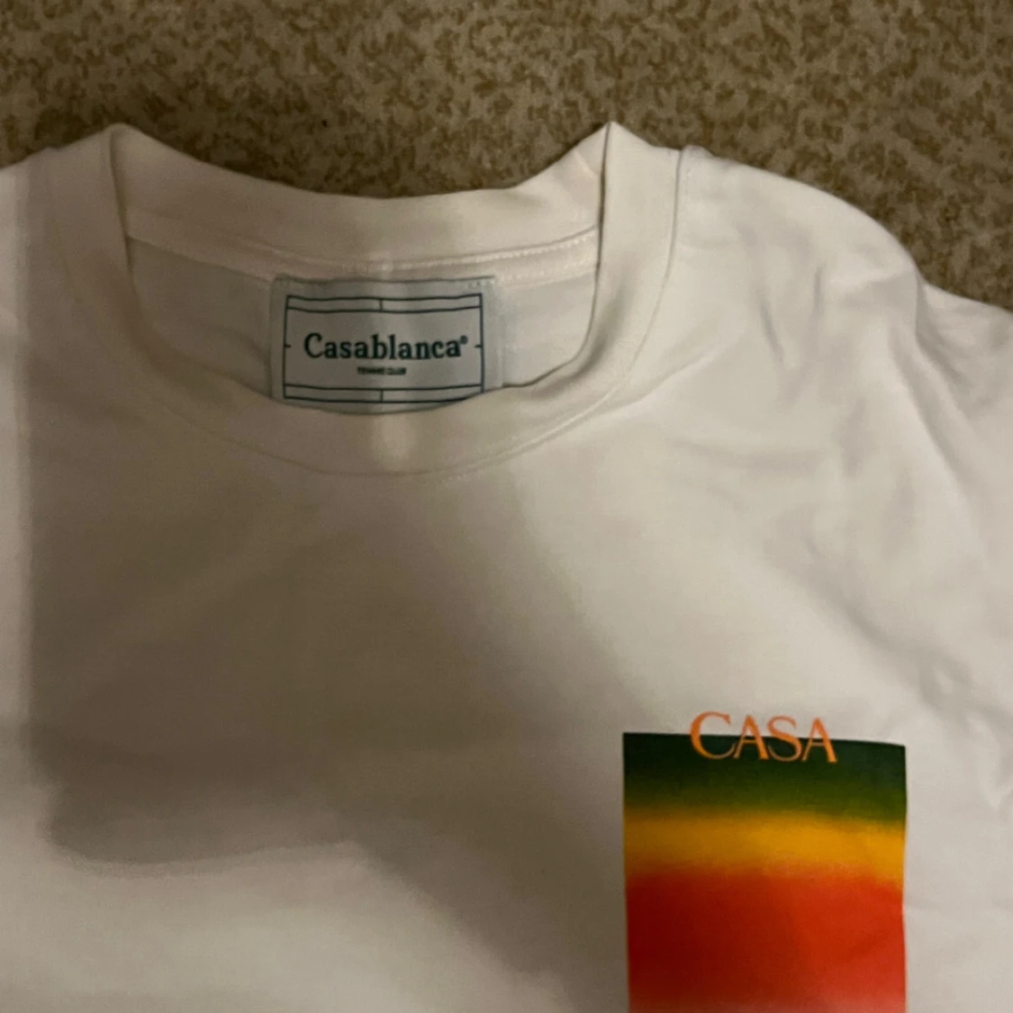 Vit t-shirt från Casablanca med färgglatt tryck i grönt, gult och orange på bröstet och ryggen. Stort 'CASA BLANCA'-tryck på ryggen. Klassisk passform och rund hals. Perfekt för dig som gillar stilrena plagg med en twist.