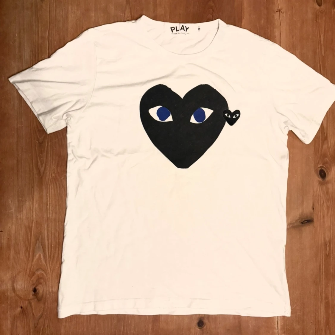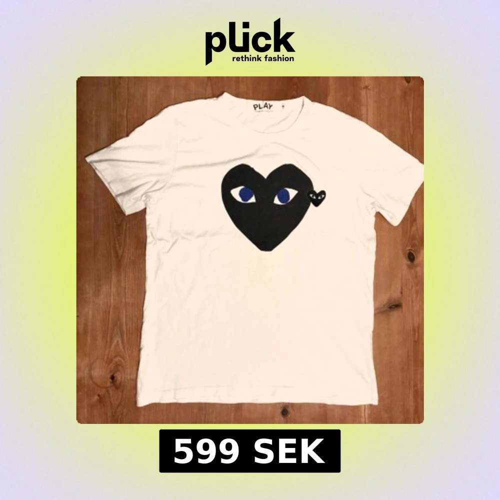 Vit t-shirt från Comme des Garçons Play med det ikoniska svarta hjärta-trycket med ögon på bröstet. Klassisk passform och rund hals. Perfekt för dig som gillar grisch stilen och vill sticka ut med en cool detalj. PASSAR STORLEK S