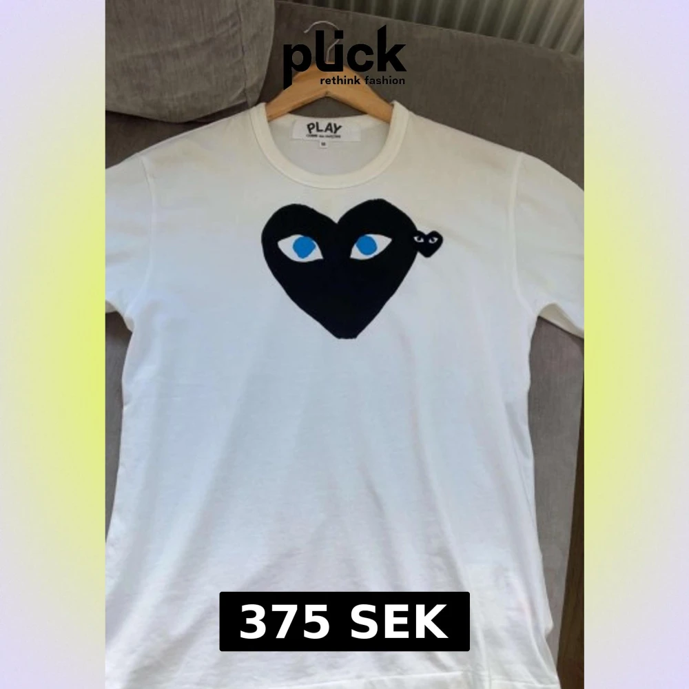 Säljer en vit t-shirt från Comme des Garçons Play i storlek M. T-shirten har ett stort svart hjärta med blå ögon tryckt på bröstet och ett mindre hjärta bredvid. Klassisk rund hals och korta ärmar. Materialet är mjuk bomull.