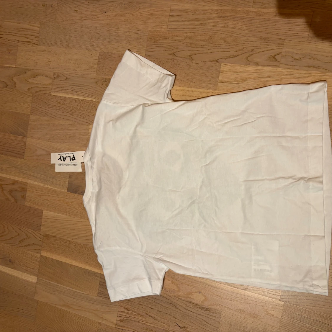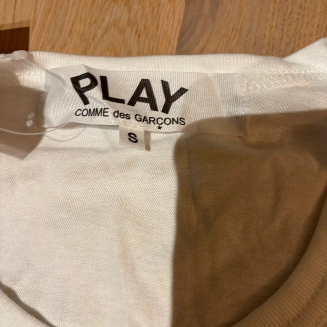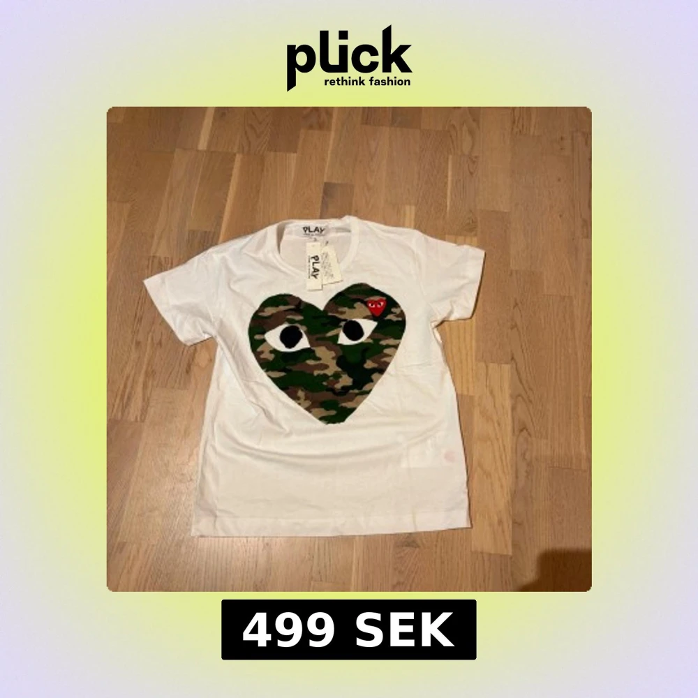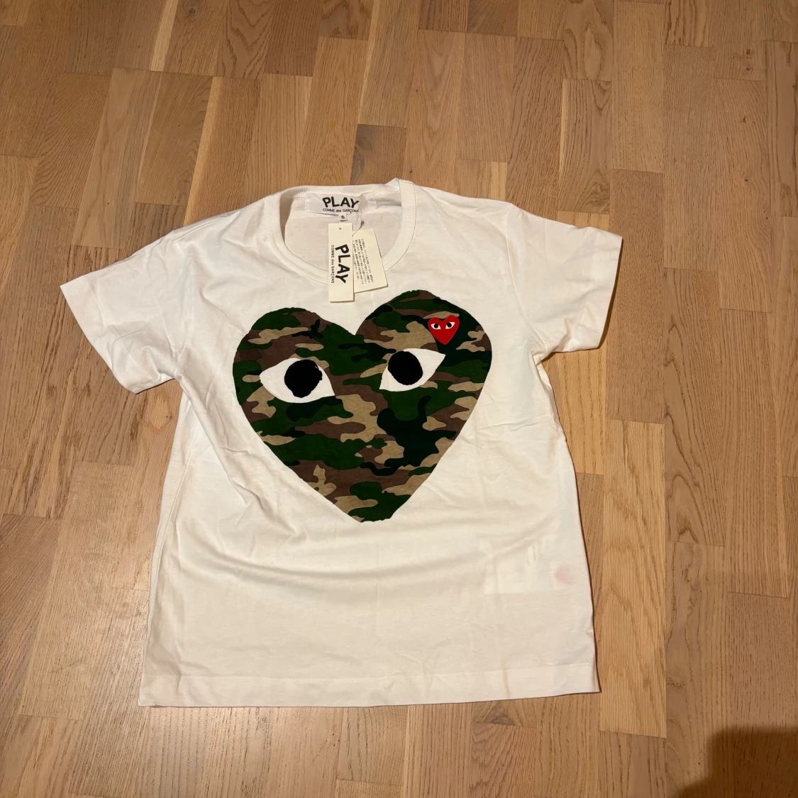 Vit t-shirt från Comme des Garçons Play med stort hjärta i camouflage på bröstet och ett litet rött hjärta med ögon. Klassisk passform och rund hals. Tillverkad i mjuk bomull, perfekt för en cool och avslappnad stil.