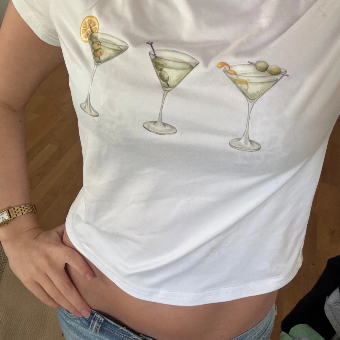Säljer en vit croppad t-shirt med tryck av tre martiniglas framtill. Perfekt för dig som gillar roliga och unika prints. T-shirten har korta ärmar och en tight passform.