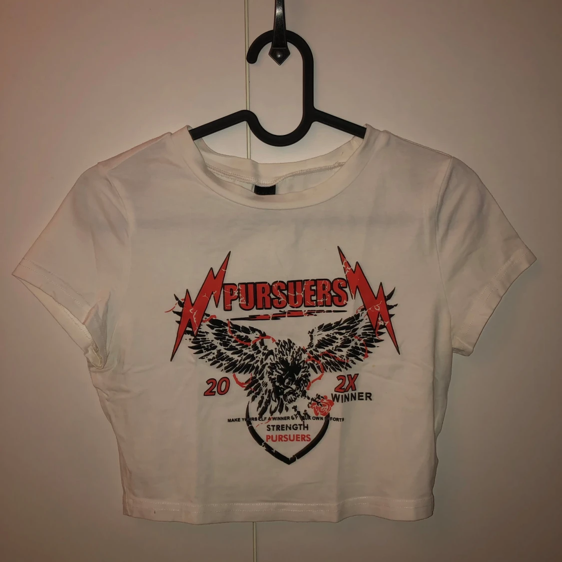 Säljer en vit croppad t-shirt med ett coolt tryck.