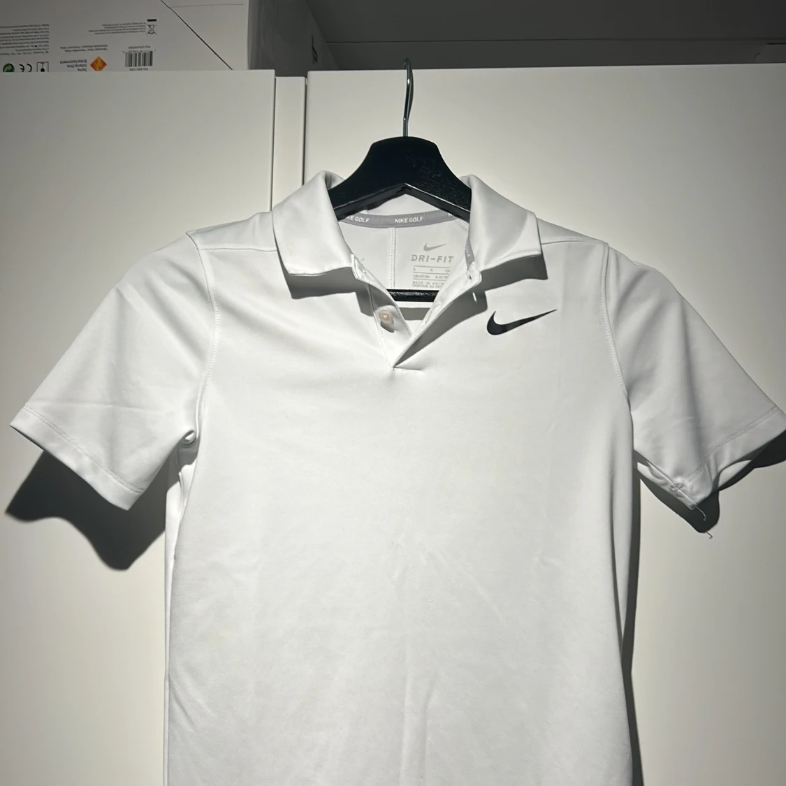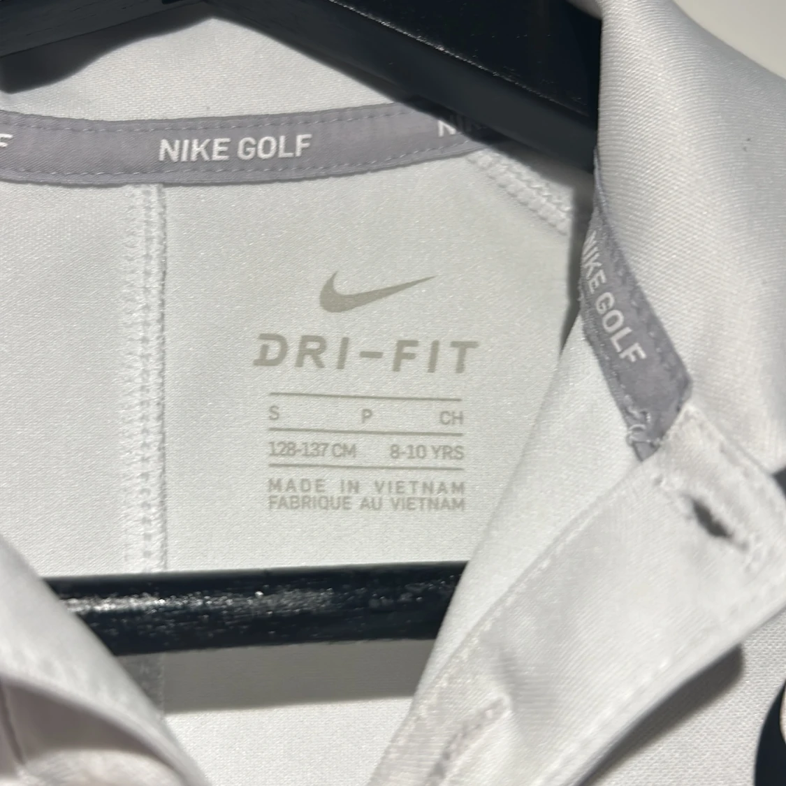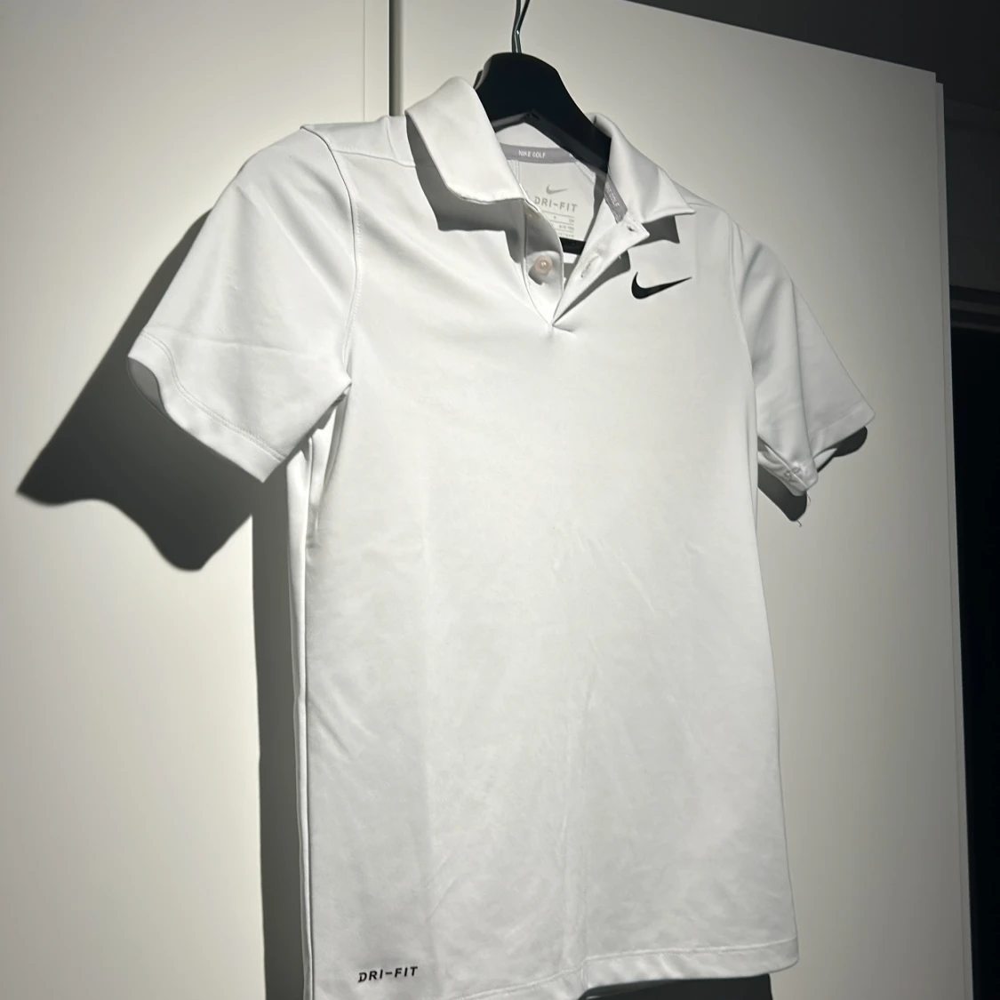 Säljer en vit Dri-FIT pikétröja från Nike Golf. Tröjan har korta ärmar och en klassisk krage med knappar. Perfekt för sportiga aktiviteter med sin bekväma passform och fukttransporterande material. Perfekt för en tränings dag eller en golf dag