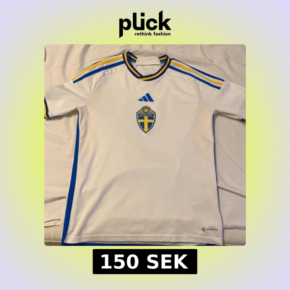 Säljer en vit fotbollströja från Adidas med Sveriges landslagsemblem på bröstet. Tröjan har blå och gula detaljer samt korta ärmar. Namnet 'ISAK' och nummer 9 är tryckt på baksidan. Perfekt för fotbollsfans!