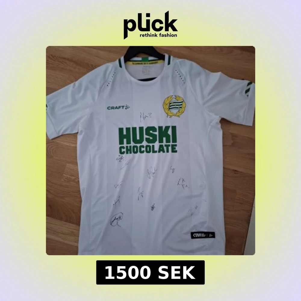 Säljer en vit Hammarby if herrlag fotbollströja från Craft med gröna detaljer och tryck av 'Huski Chocolate' på framsidan. Tröjan är kortärmad och har flera autografer på framsidan. Perfekt för samlare eller fans! Priset kan alltid diskuteras!
