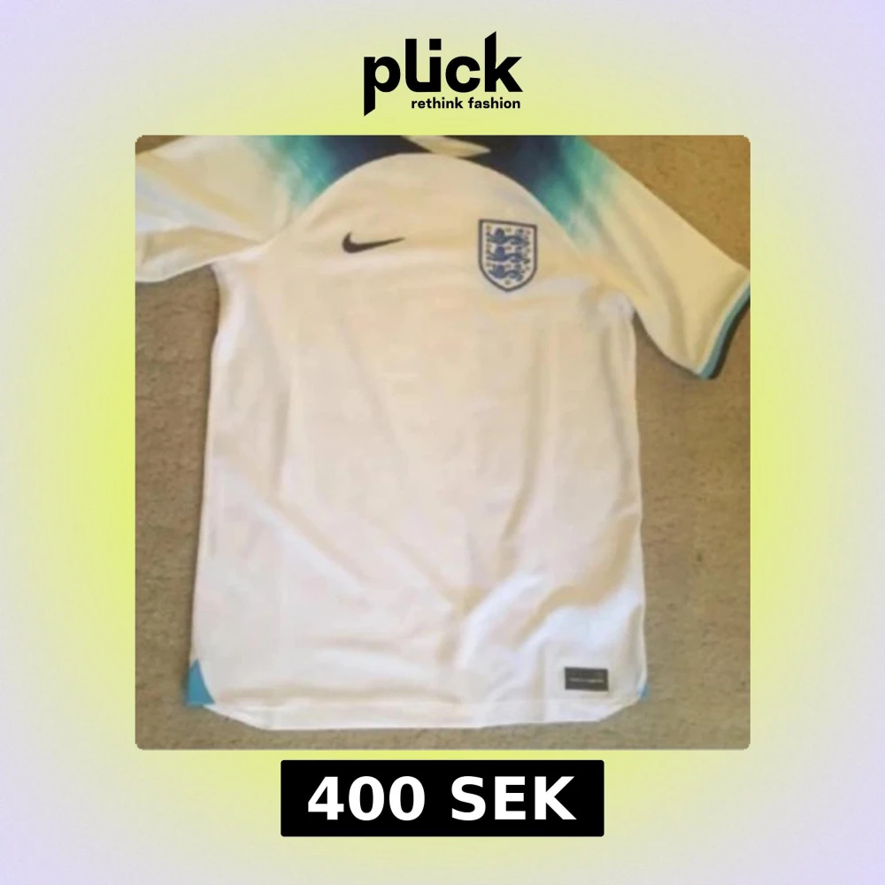 Säljer en vit fotbollströja från Nike med Englands landslagsemblem på bröstet. Tröjan har korta ärmar och ett snyggt blått mönster vid axlarna. Perfekt för fotbollsfans som vill visa sitt stöd för laget! ⚽