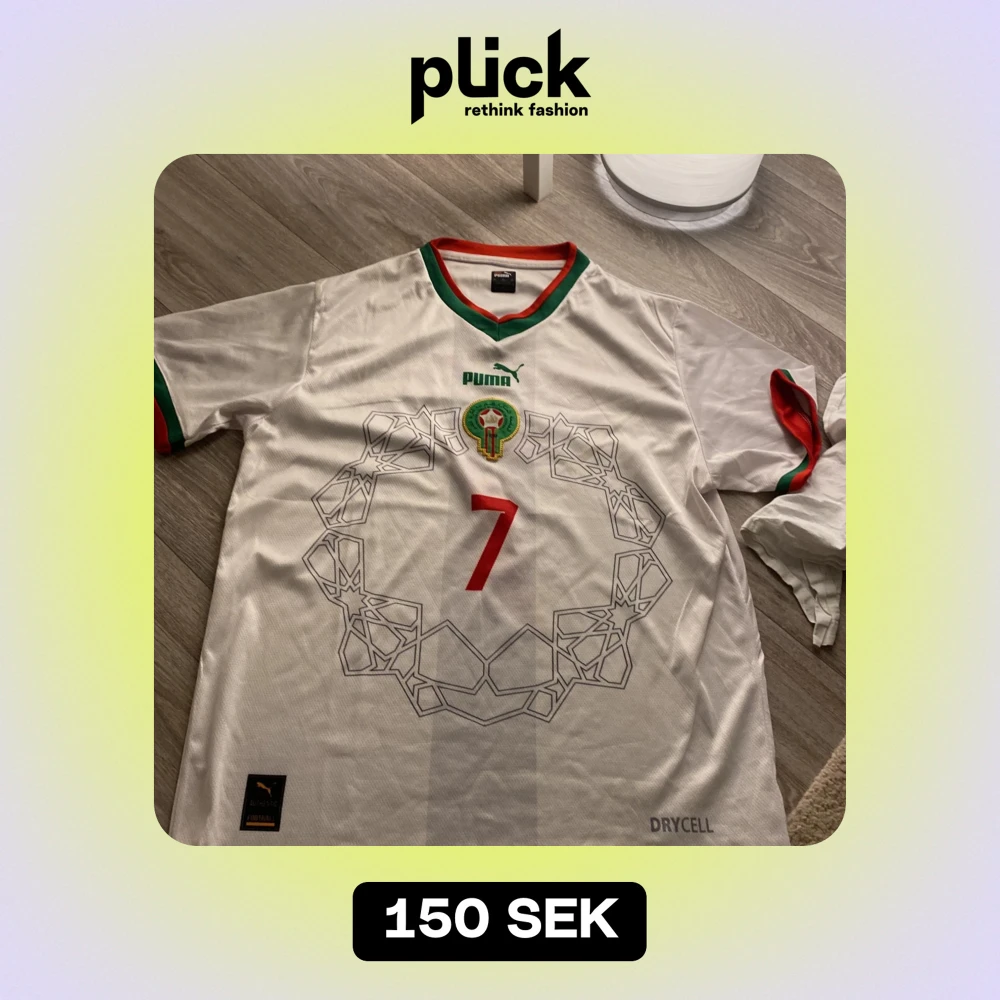 Säljer en vit fotbollströja från Puma i mycket bra skick. Den har korta ärmar och ett snyggt mönster på framsidan med nummer 7. Tröjan har gröna och röda detaljer vid kragen och ärmsluten. Perfekt för fotbollsfans som vill ha något unikt! 🏆