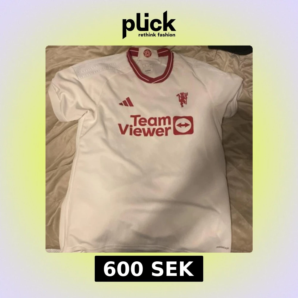 Säljer en vit fotbollströja från Adidas med röda detaljer och Team Viewer-logga på framsidan. Tröjan har korta ärmar och en rund halsringning med röd kant. Perfekt för fotbollsfans! Manchester United tröja från 23/24 säsongen i ett ny skick + ordinarie pris 1100kr!