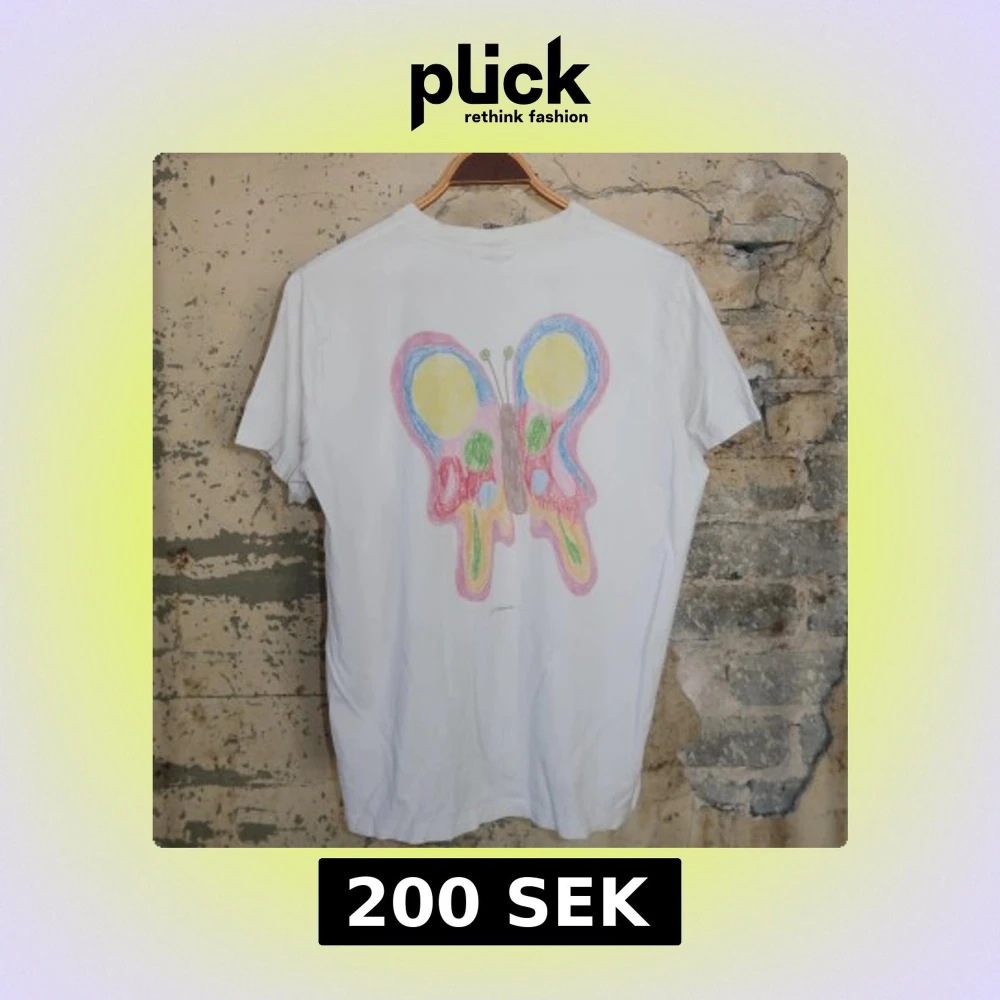 Vit t-shirt från Ganni med tryck av färgglad fjäril på ryggen i pastellfärger och svart logga framtill. Klassisk rund hals och korta ärmar. Skön och avslappnad passform, perfekt till jeans eller shorts. Tillverkad i mjuk bomull.