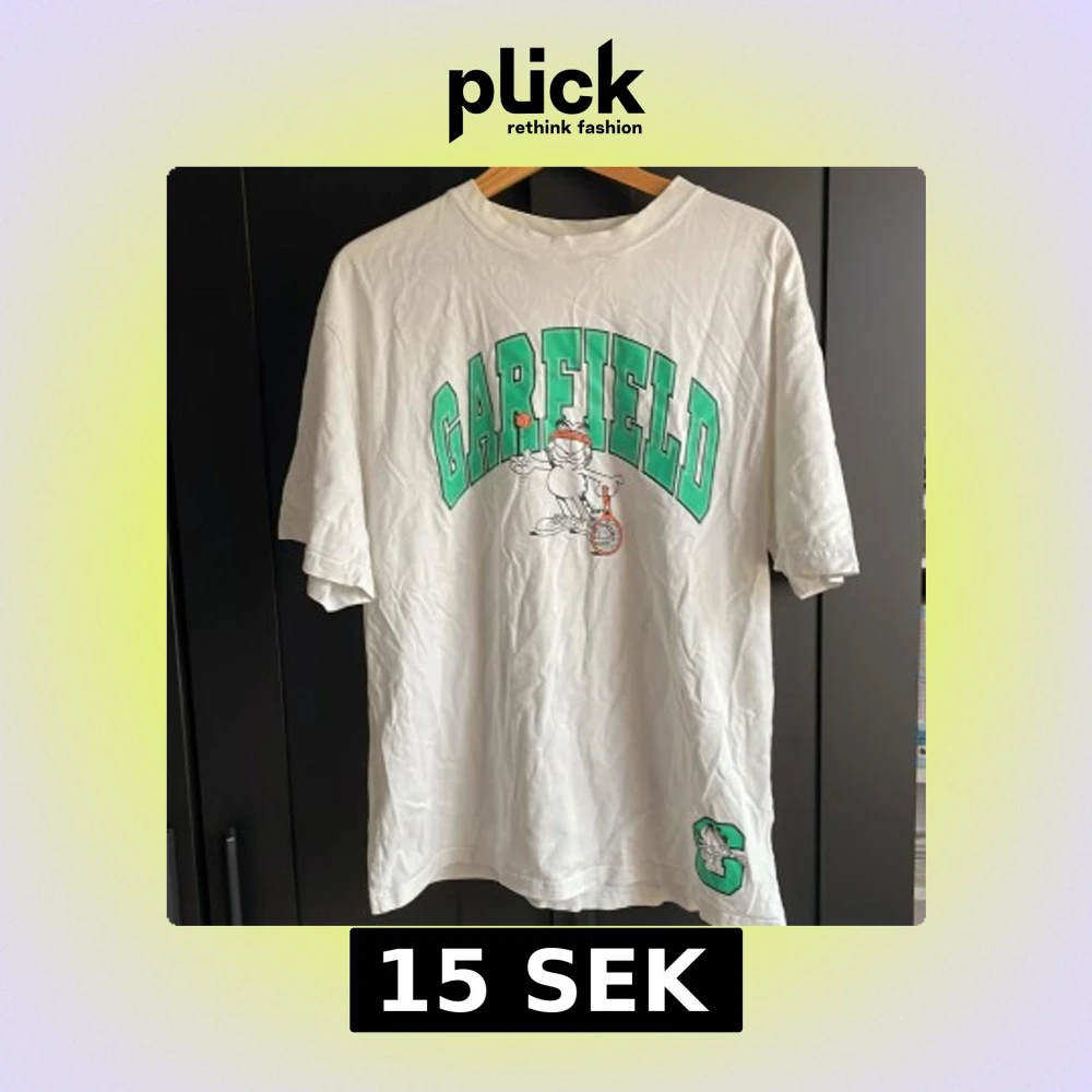 Vit t-shirt med stort grönt Garfield-tryck på bröstet och en tecknad Garfield som spelar tennis. Extra detalj med ett grönt C och Garfield nere vid fållen. Skön passform och klassisk rund hals.