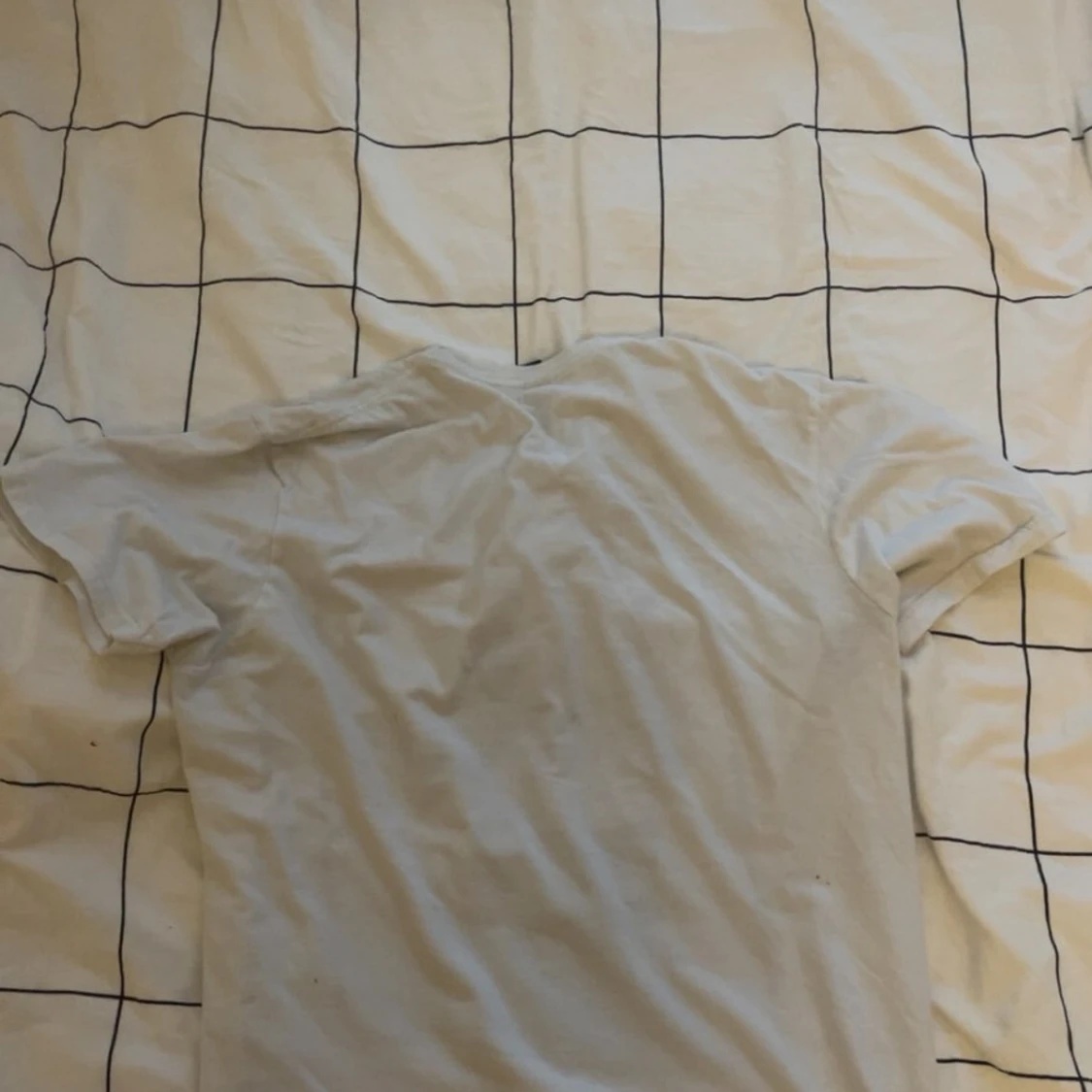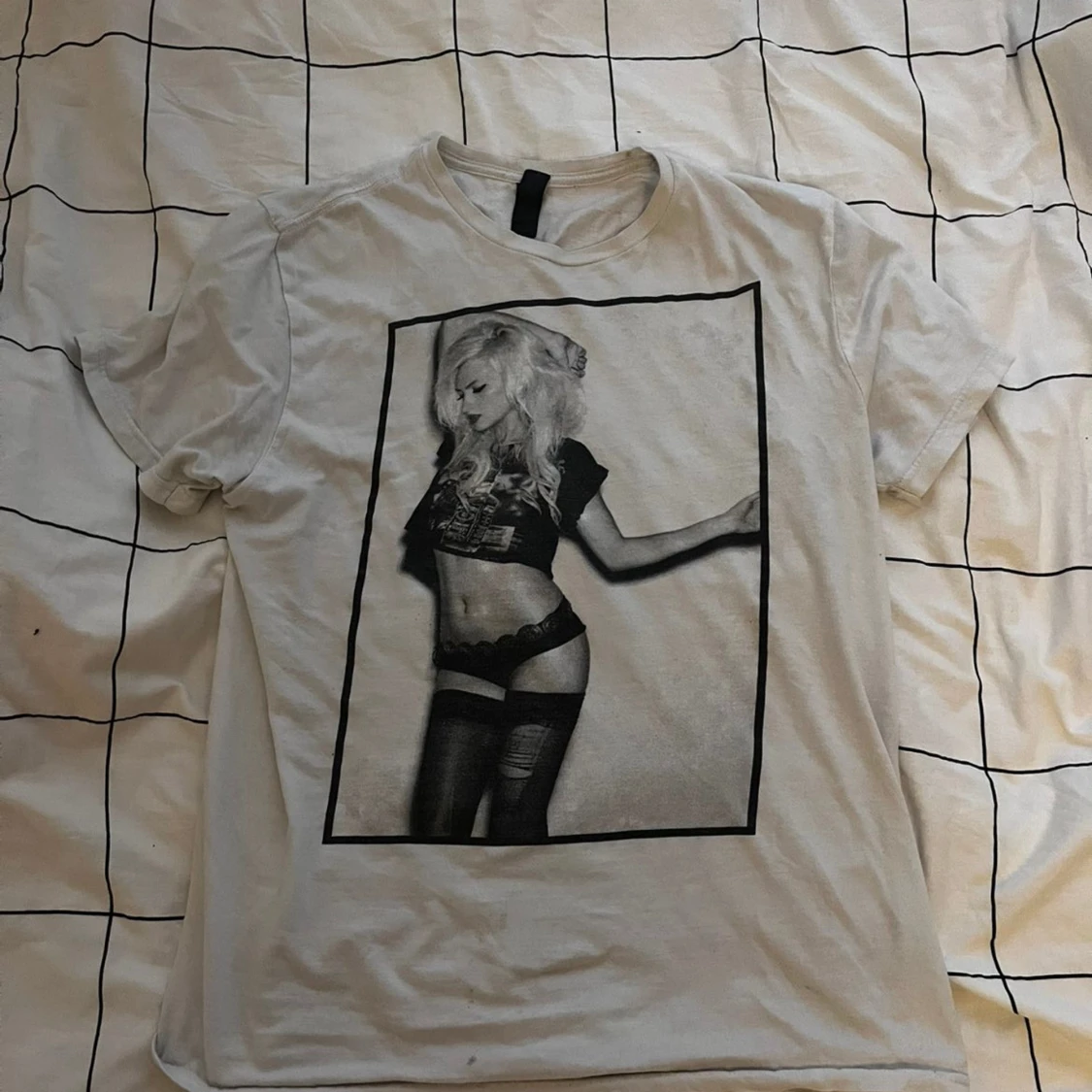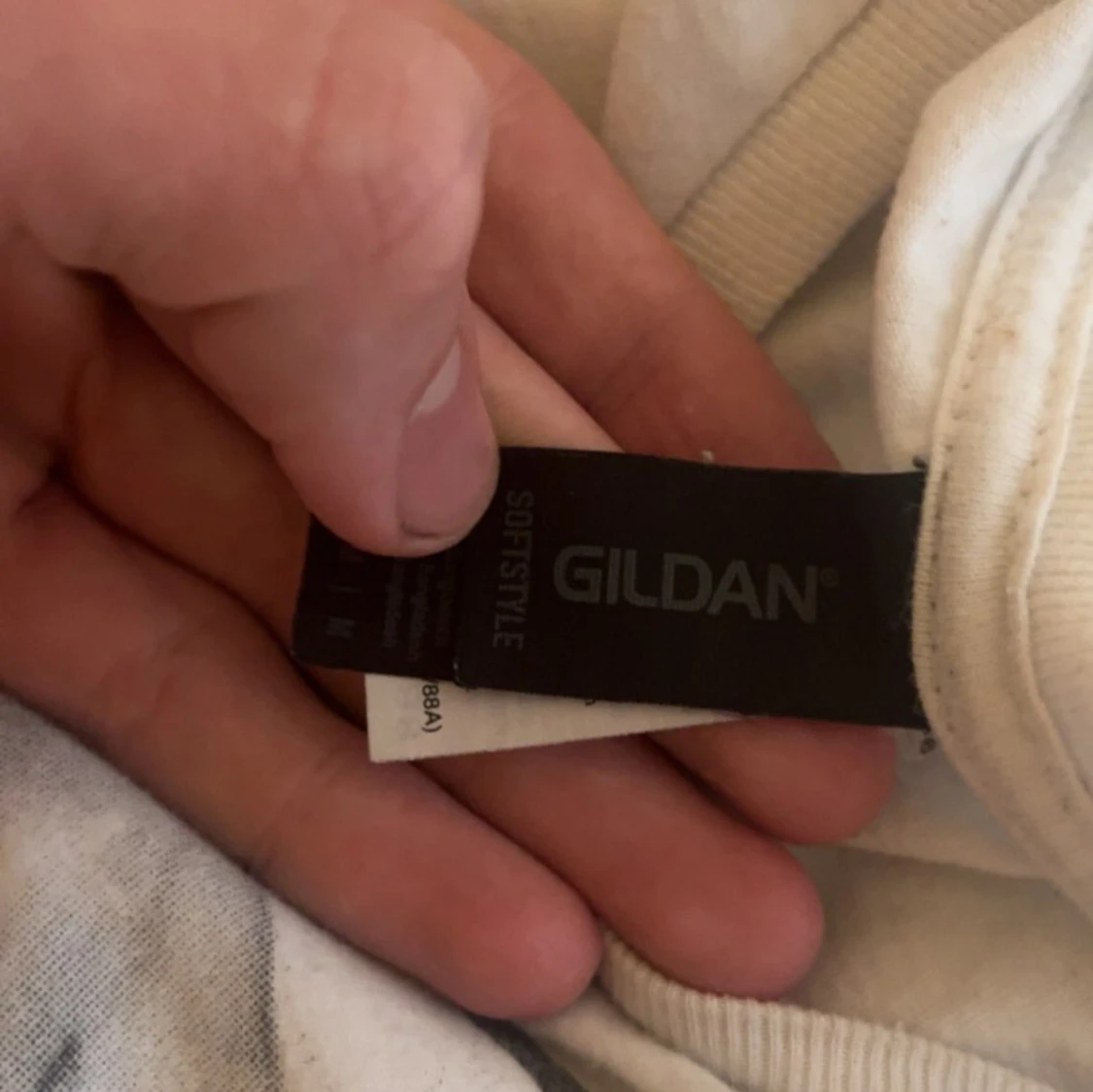 Vit t-shirt från Gildan med ett stort svartvitt tryck på framsidan som föreställer en person i edgy stil. Klassisk passform med rund hals och korta ärmar. Mjuk och skön bomullskvalitet, perfekt för en cool streetwear-look.