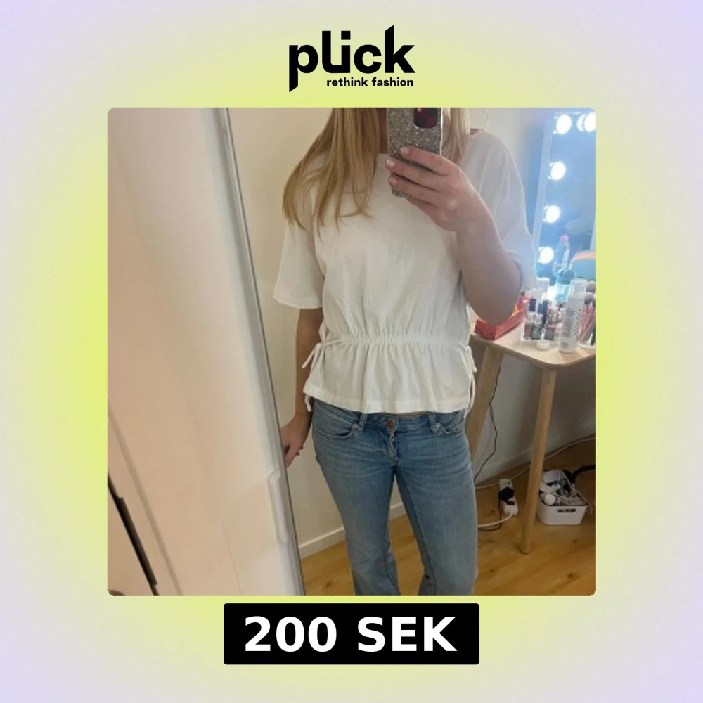 Säljer en jättesnygg vit t-shirt med korta ärmar och knytband i midjan. Den är från hm och passar xs-s