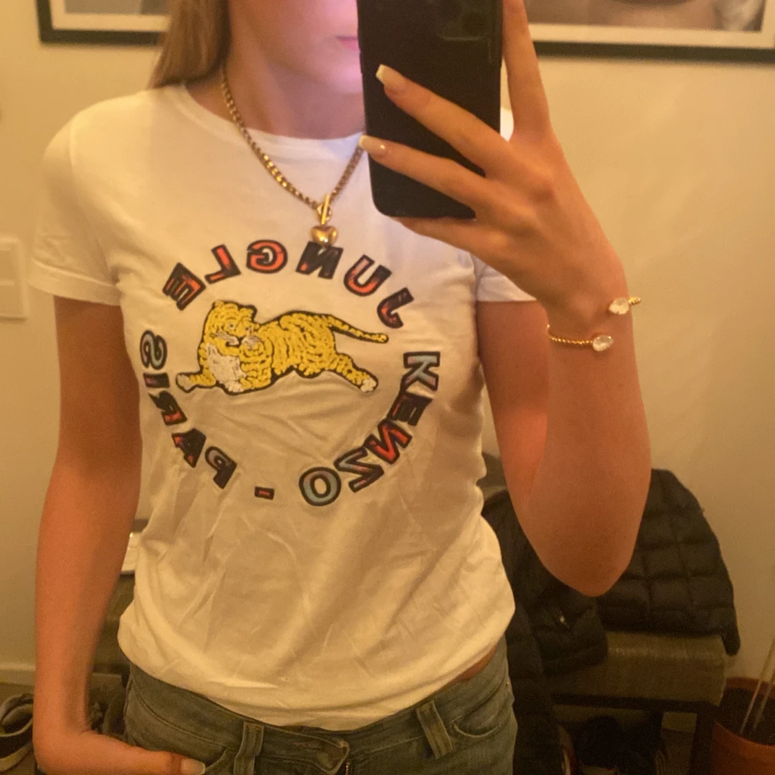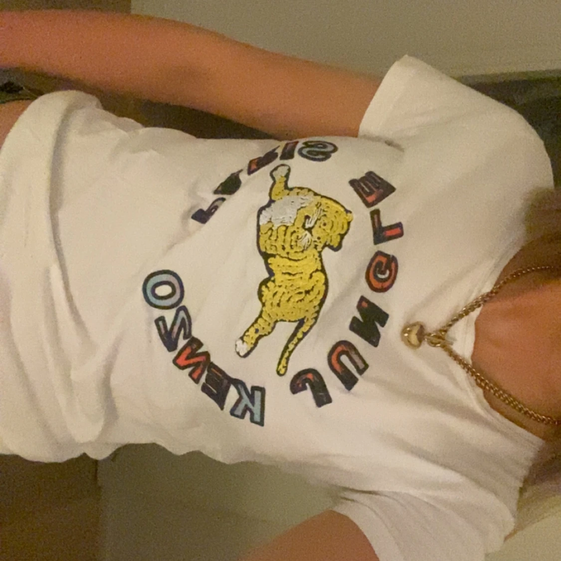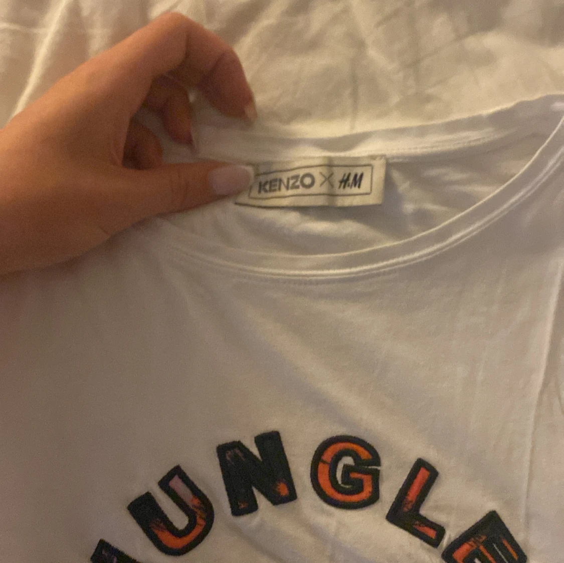Vit t-shirt från Kenzo x H&M med färgglad tryckt tiger och texten 'Jungle Kenzo Paris' i coola bokstäver på bröstet. Rund hals och korta ärmar, tillverkad i mjuk bomull. Perfekt statement-plagg som köptes begagnat!