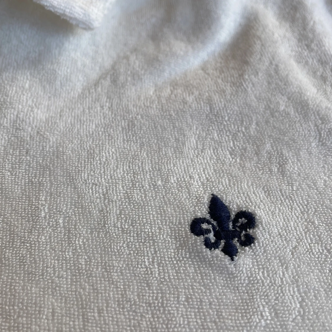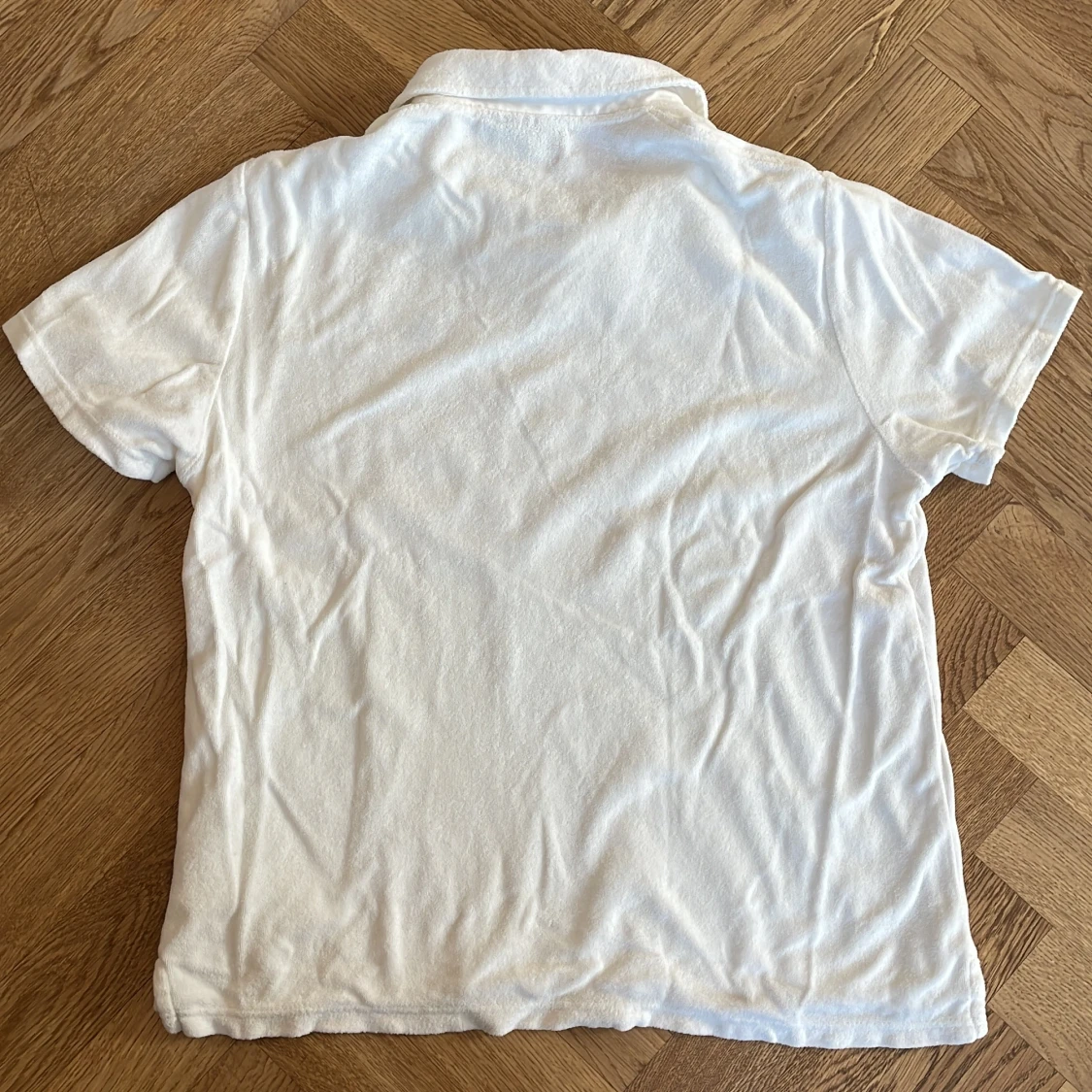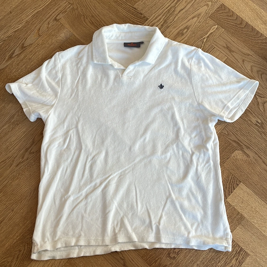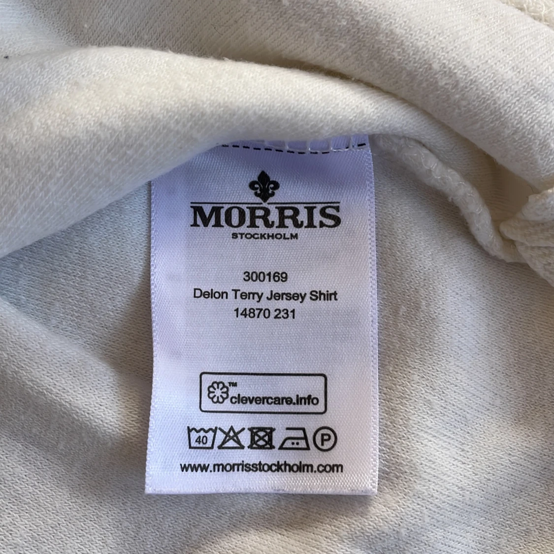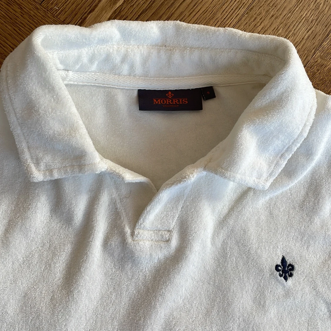 Säljer en stilren vit pikétröja från Morris med korta ärmar och en klassisk krage. Tröjan har en liten broderad detalj på bröstet och är tillverkad i ett mjukt material.