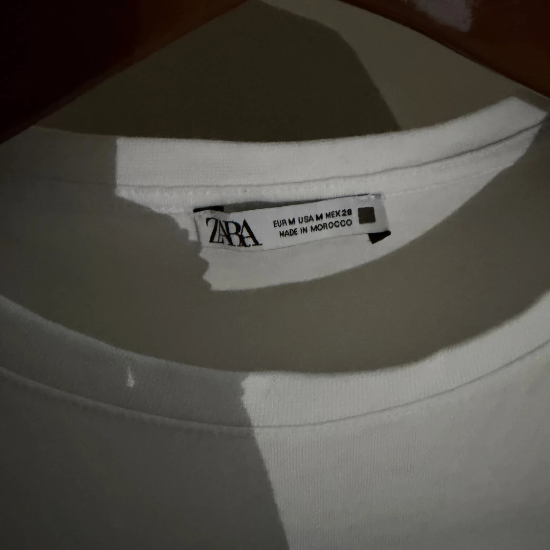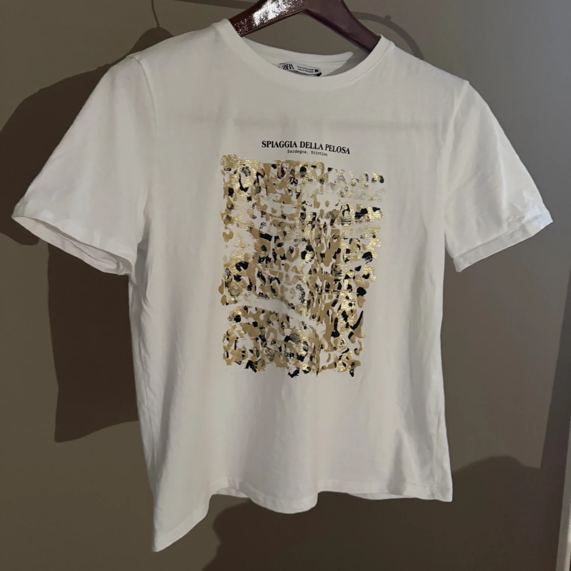 Vit t-shirt från Zara med coolt leopardmönster i guld och svart framtill. Trycket har texten 'SPIAGGIA DELLA PELOSA' ovanför. Klassisk passform med korta ärmar och rund hals. Perfekt för dig som vill sticka ut lite extra.