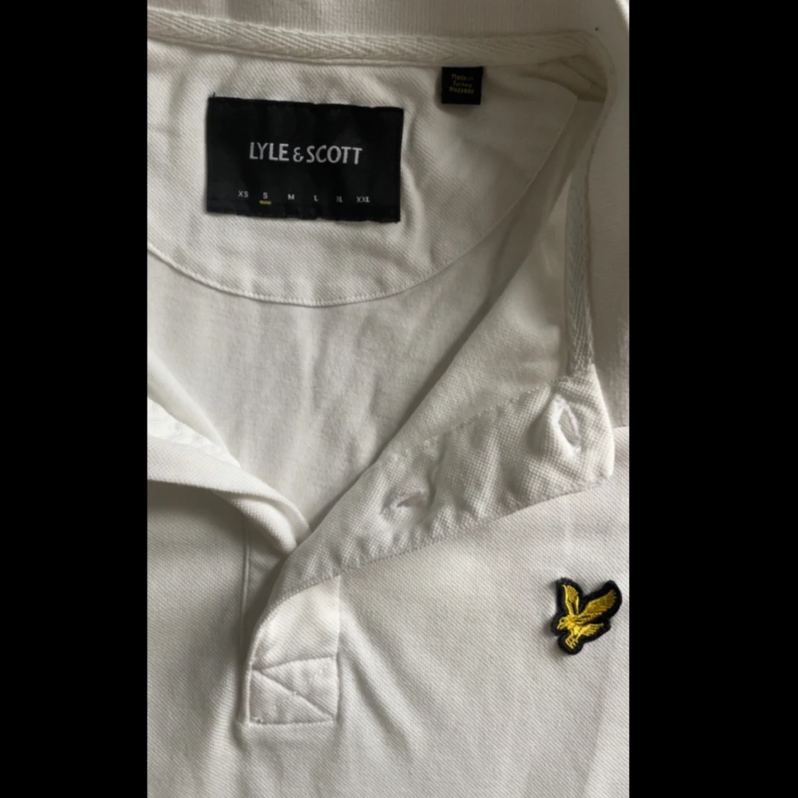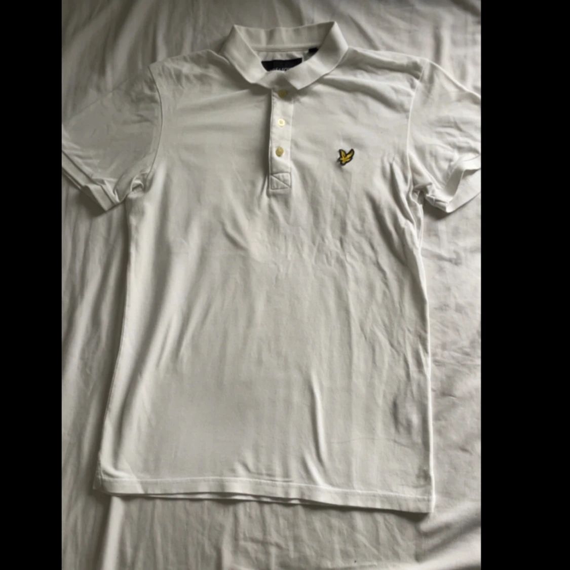 Vit pikétröja från Lyle & Scott med klassisk krage, tre knappar och den ikoniska gula örnloggan på bröstet. Tillverkad i mjuk bomull, perfekt för en clean och stilren look.