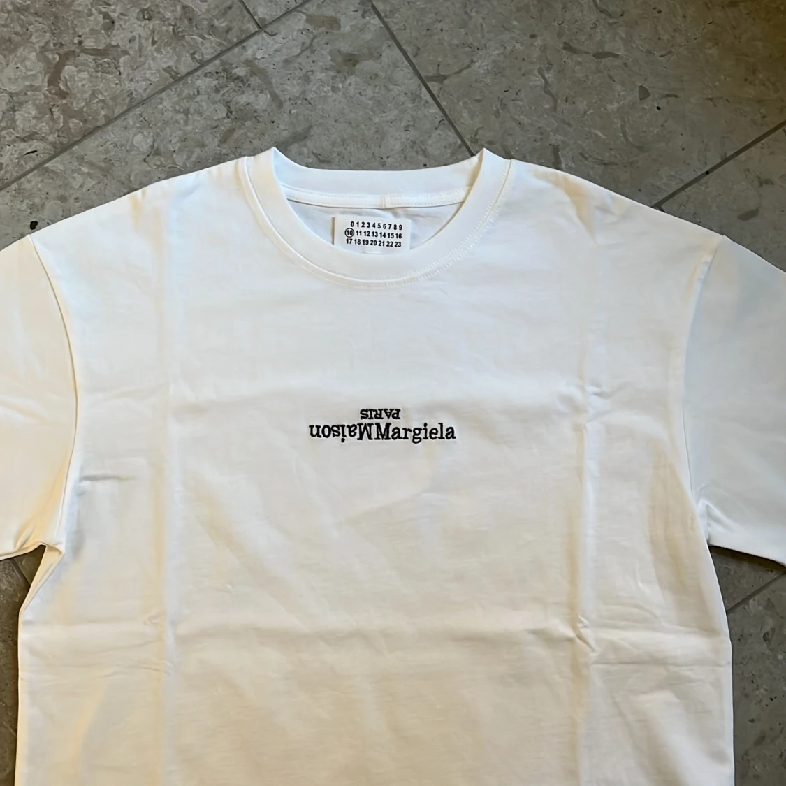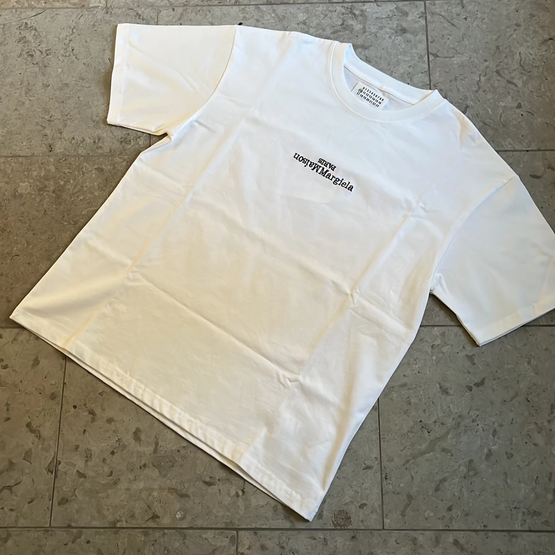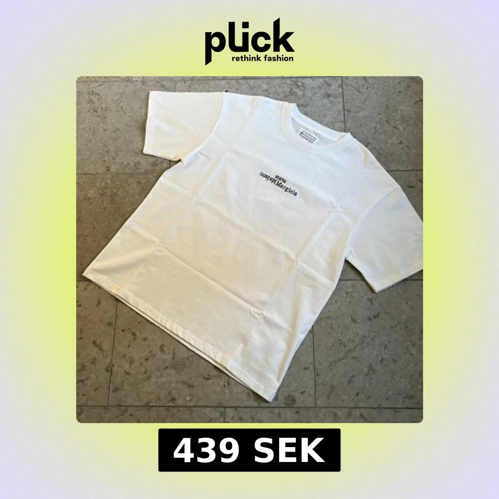 Säljer en clean vit t-shirt från Maison Margiela med svart logga i storlek M. Nytt skick och fraktas inom 24h✅