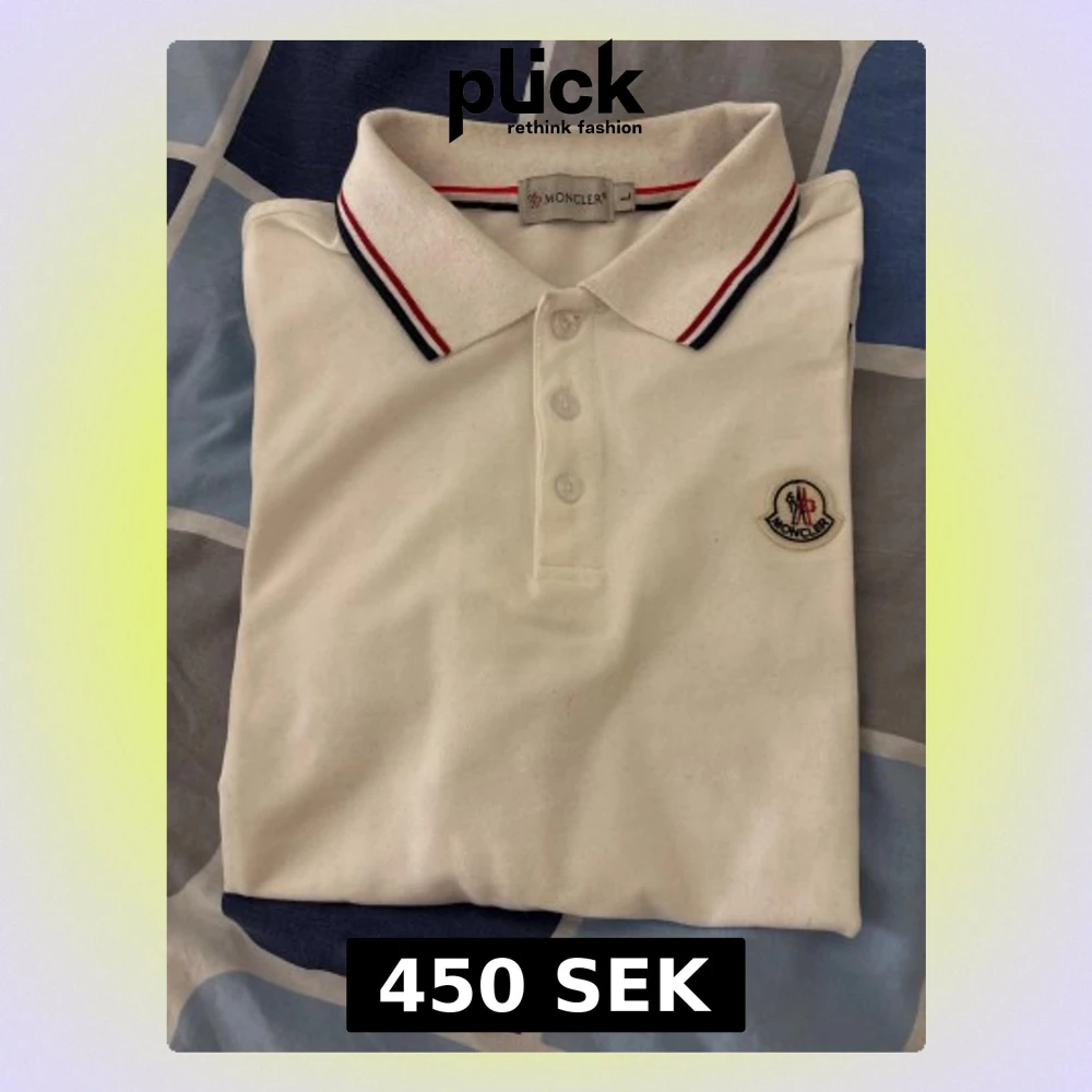 Snygg vit pikétröja från Moncle med klassisk krage och knäppning framtill. Kragen och ärmsluten har stilrena rödblå ränder. Tröjan har Moncler-logga broderad på bröstet och är gjord i mjuk bomull. Perfekt för dig som gillar clean och sportig stil. Strl m men passar även för L