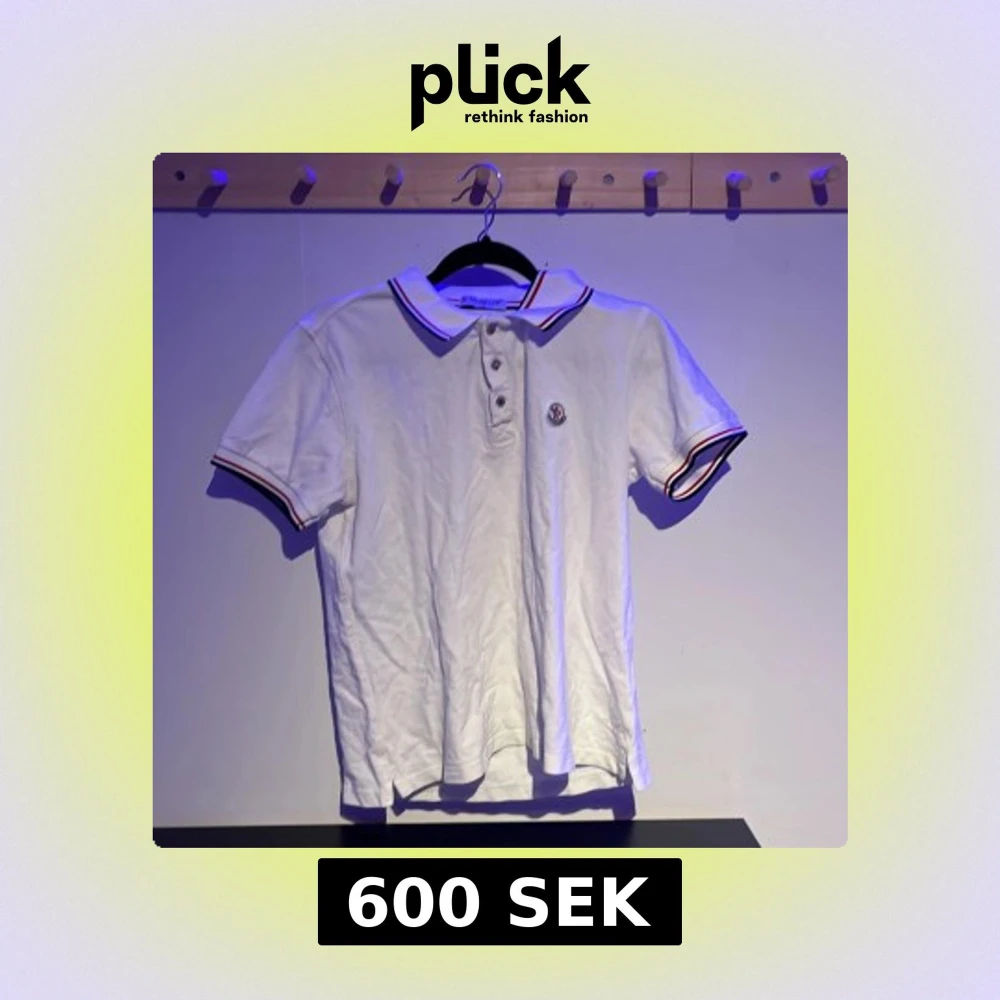 Säljer en stilren vit pikétröja från Moncler med klassisk krage och knappar framtill. Tröjan har korta ärmar med randiga detaljer i rött och blått på krage och ärmslut. Perfekt för en avslappnad men ändå snygg look. Har inte använts så mycket. Står M men passar S