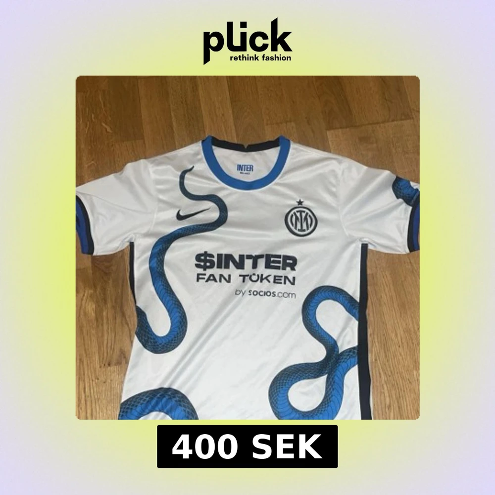 Säljer en vit och blå Inter Milano fotbollströja från Nike. Tröjan har ett unikt ormmönster i blått och svart, med klubbens emblem och sponsorloggor på framsidan. Den har korta ärmar med blå detaljer vid ärmsluten.