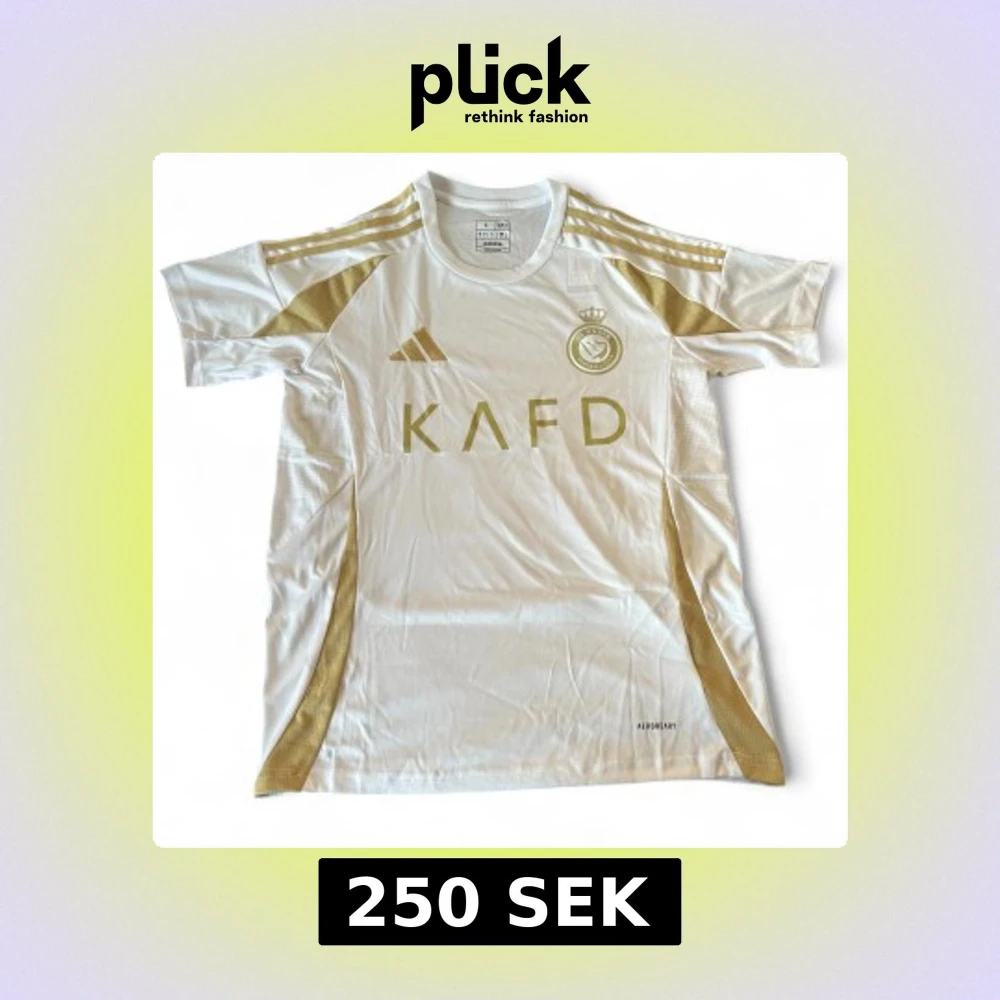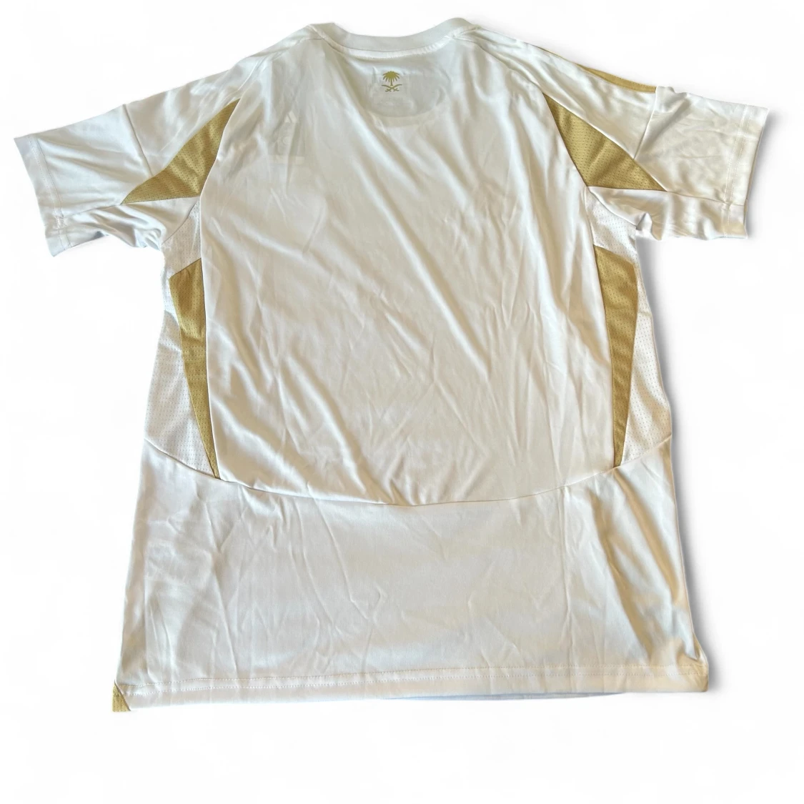 Snygg vit fotbollströja från Al Nassr med guldiga detaljer och Adidas-logga. Kortärmad modell med guldiga ränder på axlarna och sidorna, samt klubbmärke och KAFD-tryck på bröstet. Tillverkad i lätt och ventilerande polyester med Aeroready-teknologi.