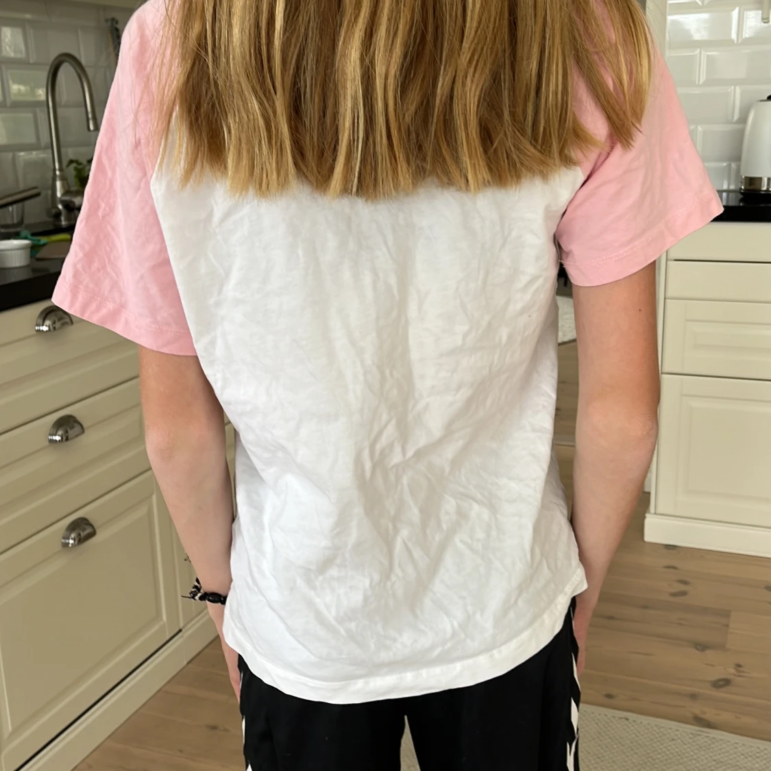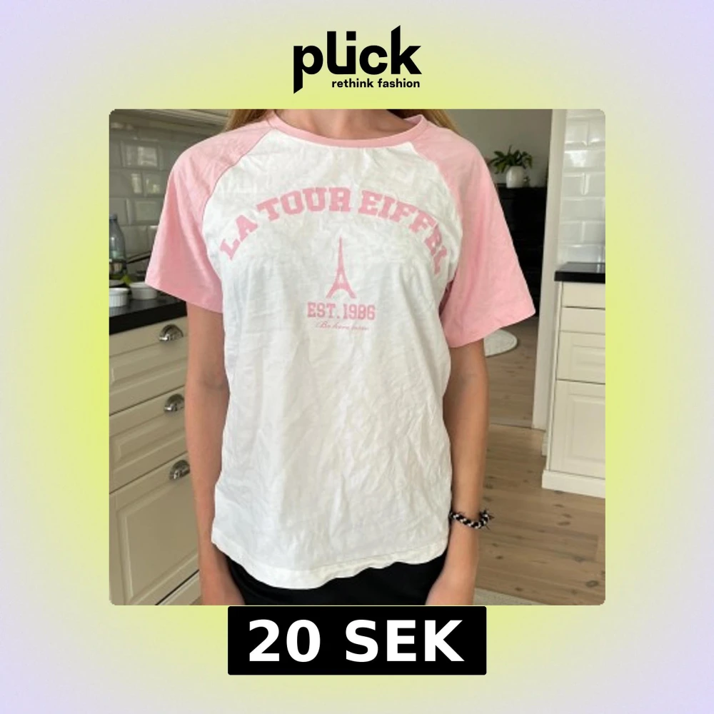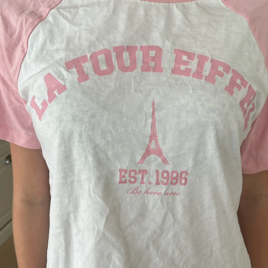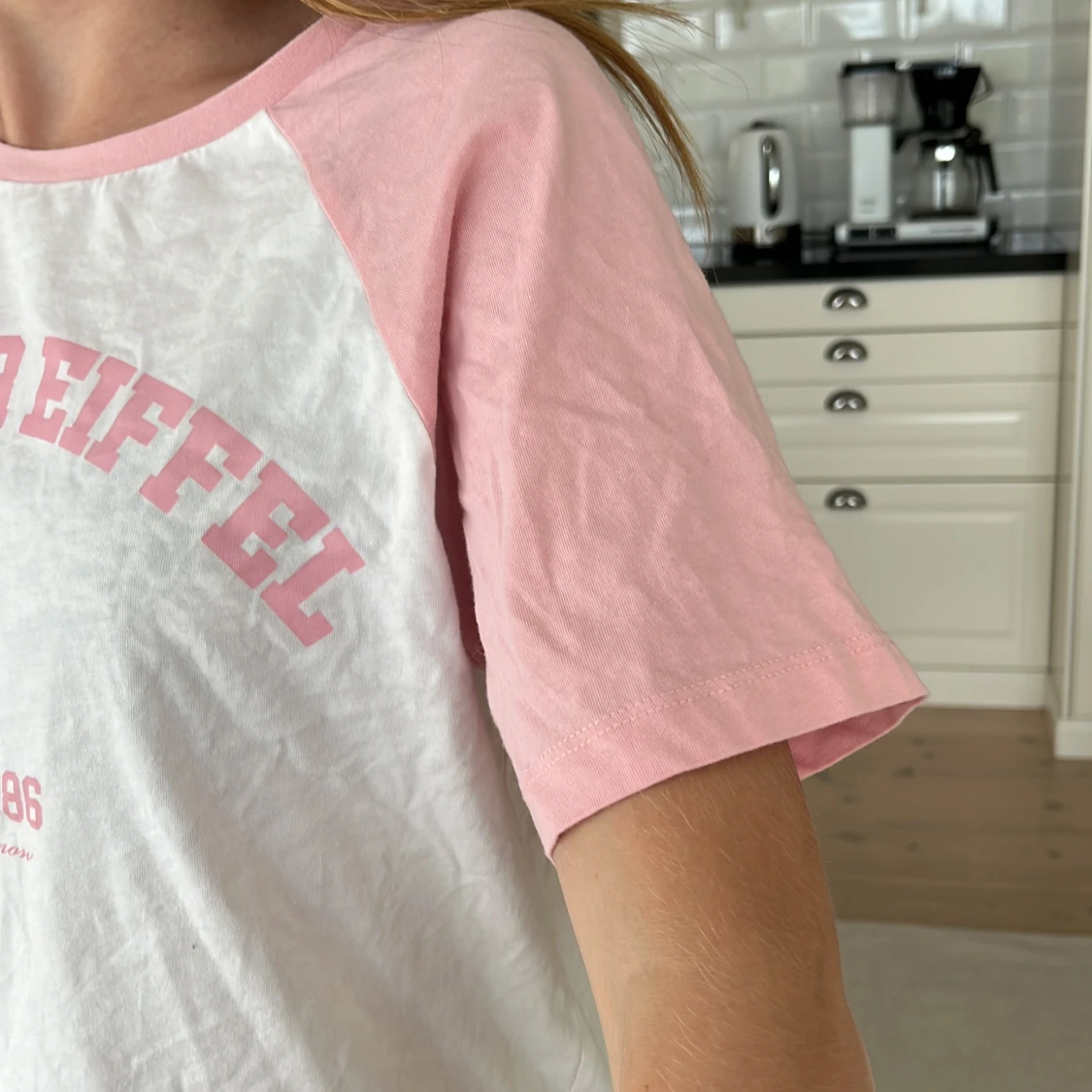 Snygg t-shirt med vit bas och ljusrosa ärmar samt tryck framtill med texten 'La Tour Eiffel' och Eiffeltornet. Klassisk rund halsringning och avslappnad passform. Perfekt för dig som gillar Paris-vibes och mjuka färger.
