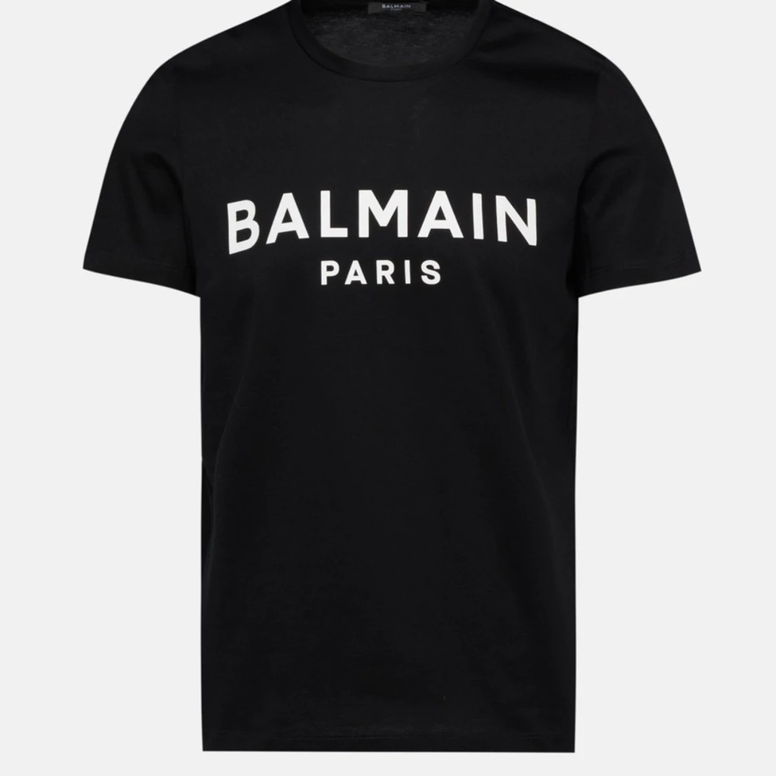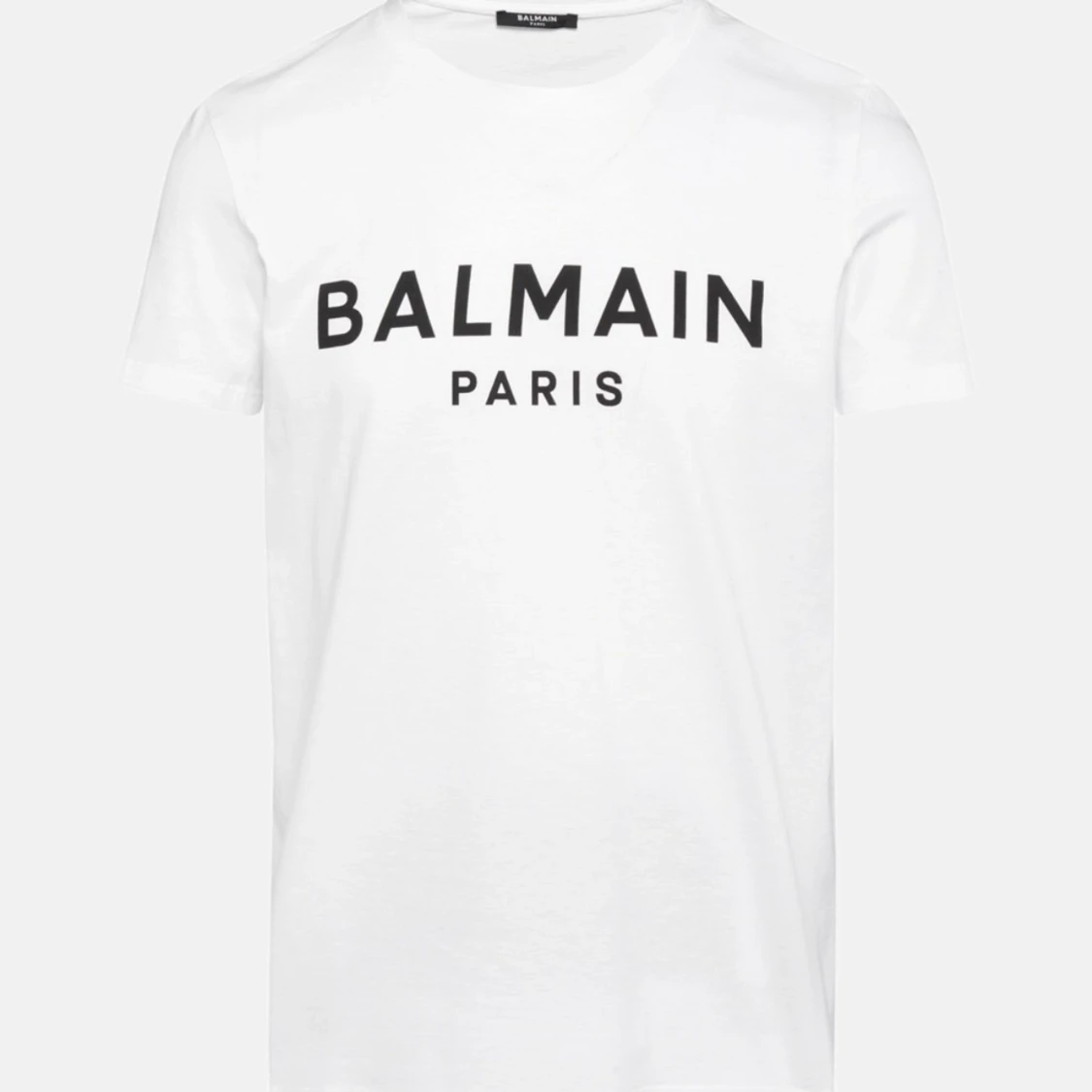 Säljer två snygga t-shirts från Balmain i klassiska färger. Den ena är vit med svart text och den andra är svart med vit text. Båda har korta ärmar och är gjorda i mjuk bomull. Perfekta för en stilren look!