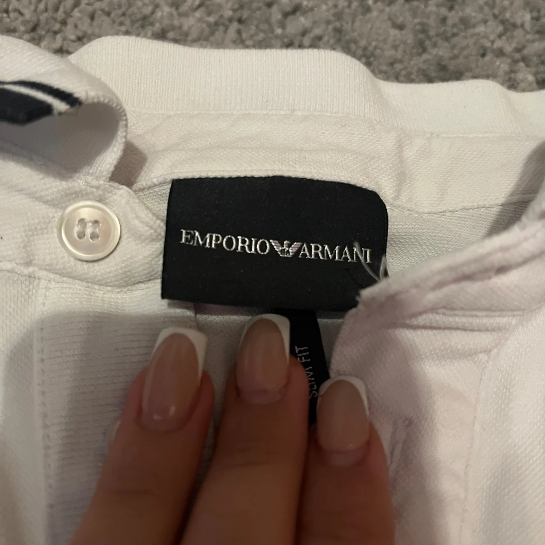 Vit pikétröja från Emporio Armani med svart EA-logga på bröstet. Klassisk krage med svarta ränder och knäppning framtill. Ärmarna har svarta detaljer vid mudden. Perfekt för en clean och stilren look.