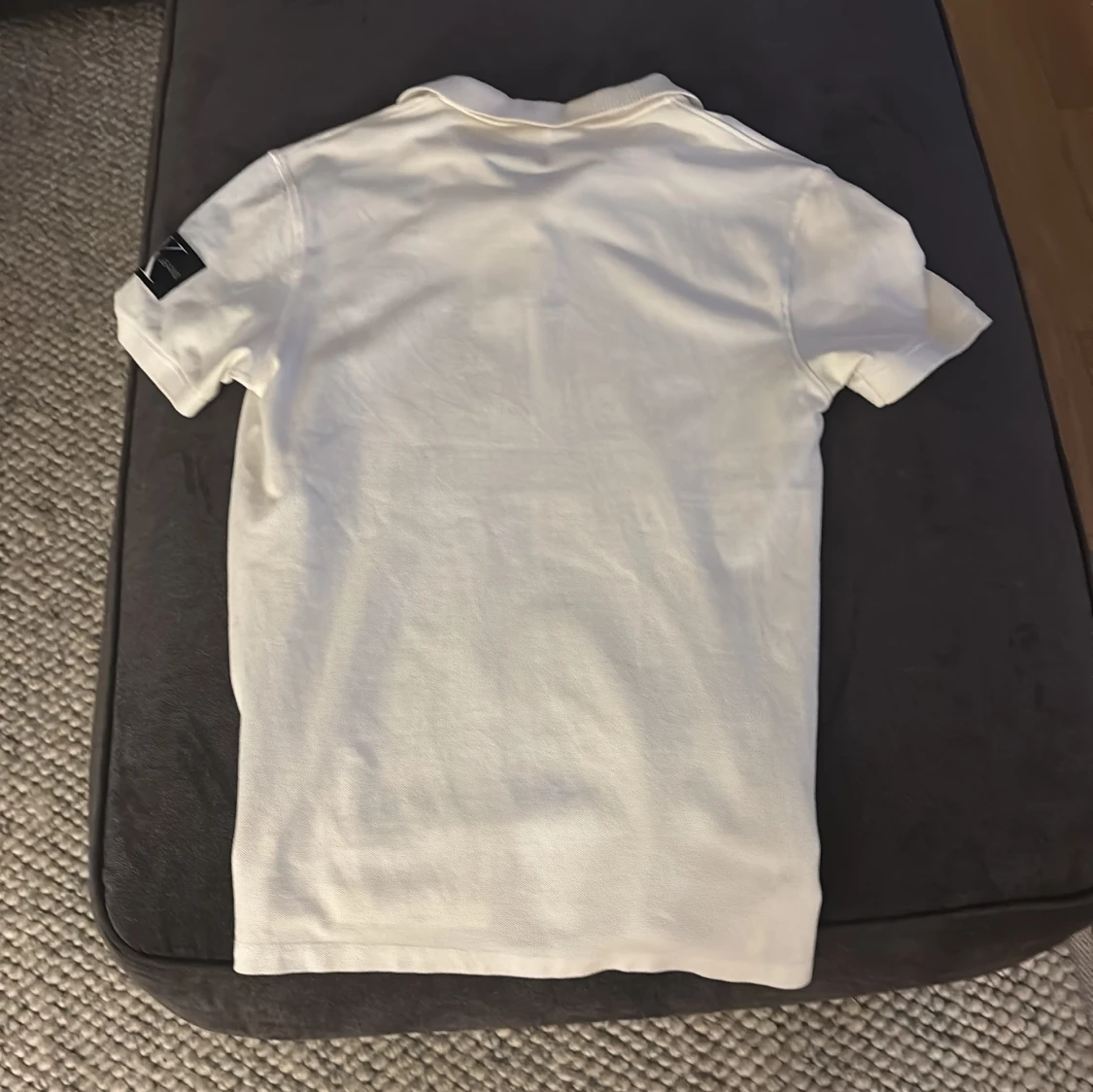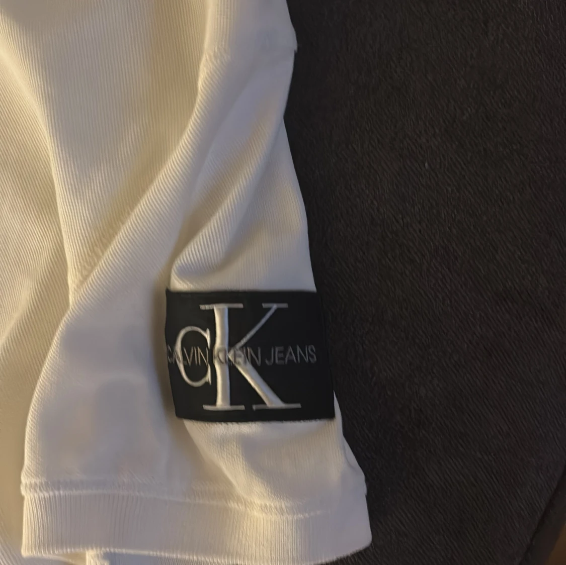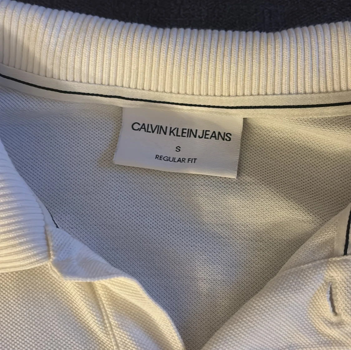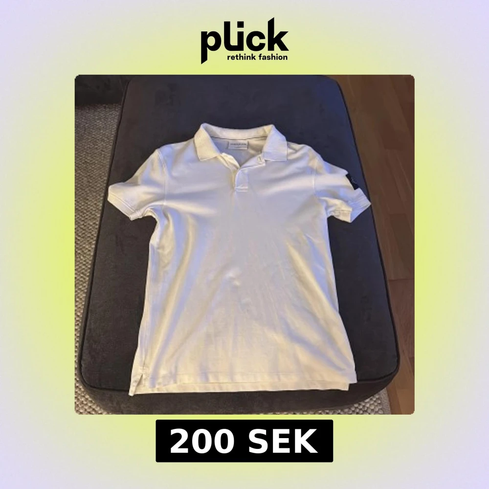 Säljer en stilren vit pikétröja från Calvin Klein Jeans. Tröjan har korta ärmar och en klassisk krage med knappdetalj. Perfekt för en avslappnad men ändå snygg look. Märkeslogga på ärmen ger en extra touch av stil.