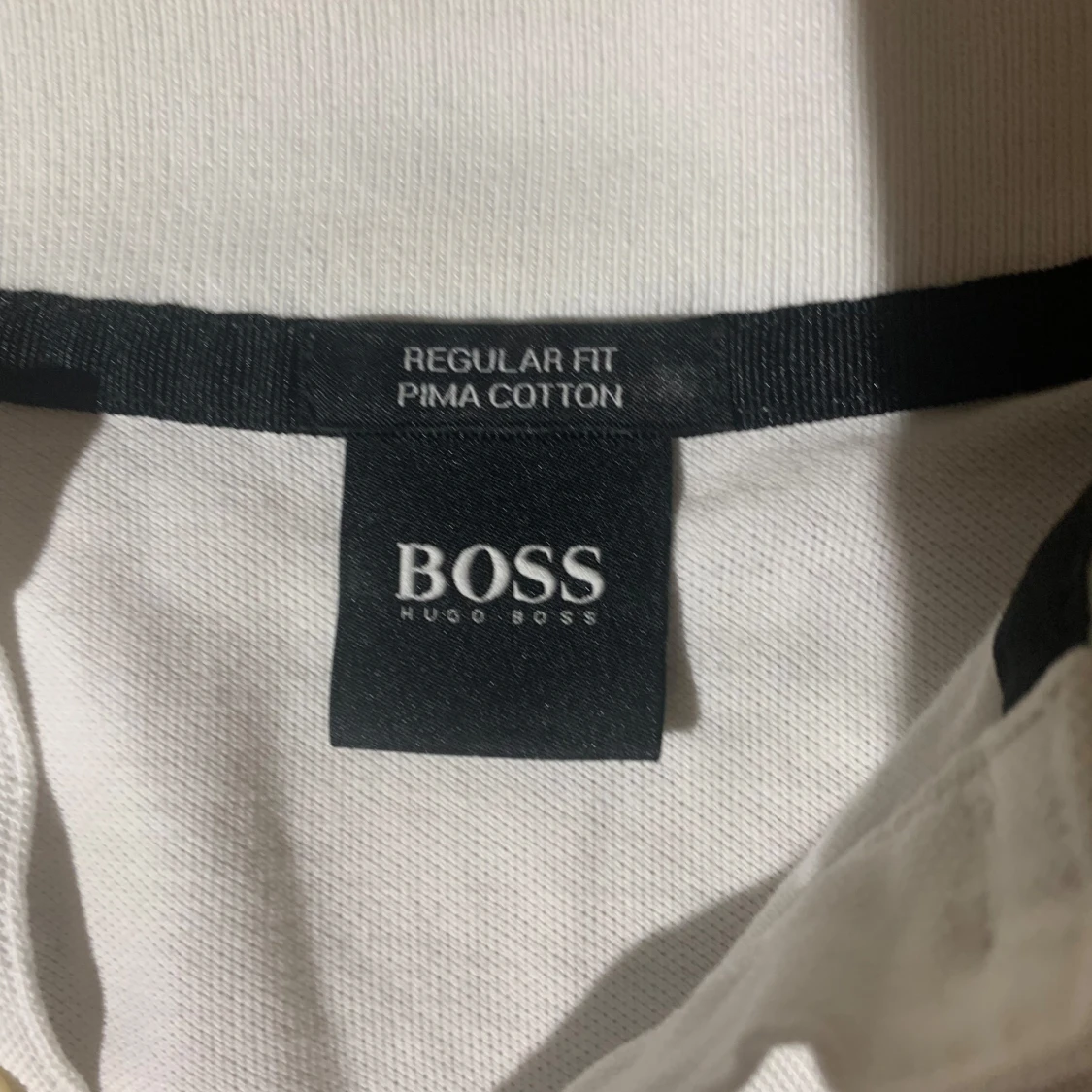 Säljer en stilren vit pikétröja från Hugo Boss i. Tröjan har korta ärmar och en klassisk krage med knappar. Perfekt för en avslappnad men ändå elegant look. Storlek S