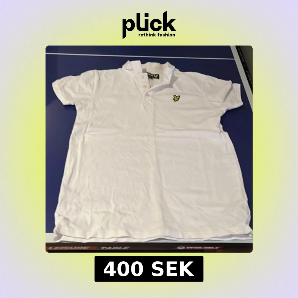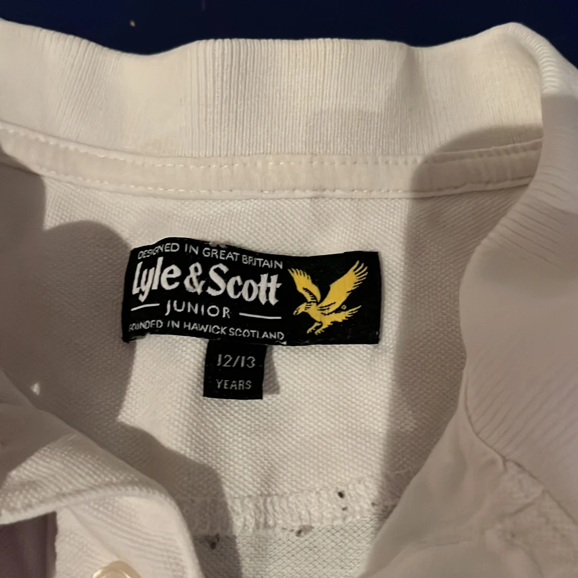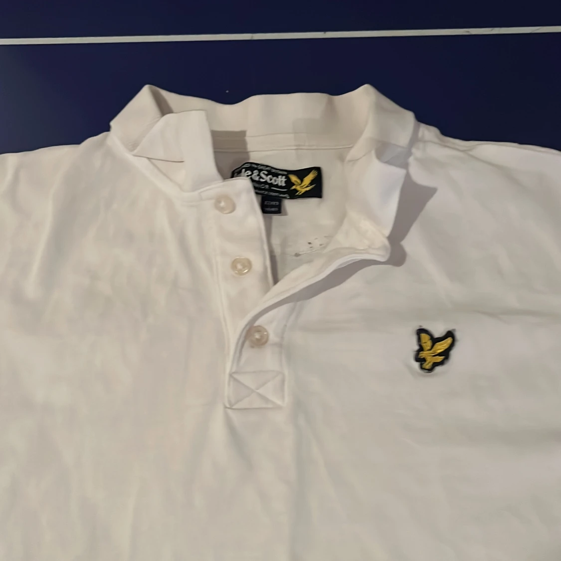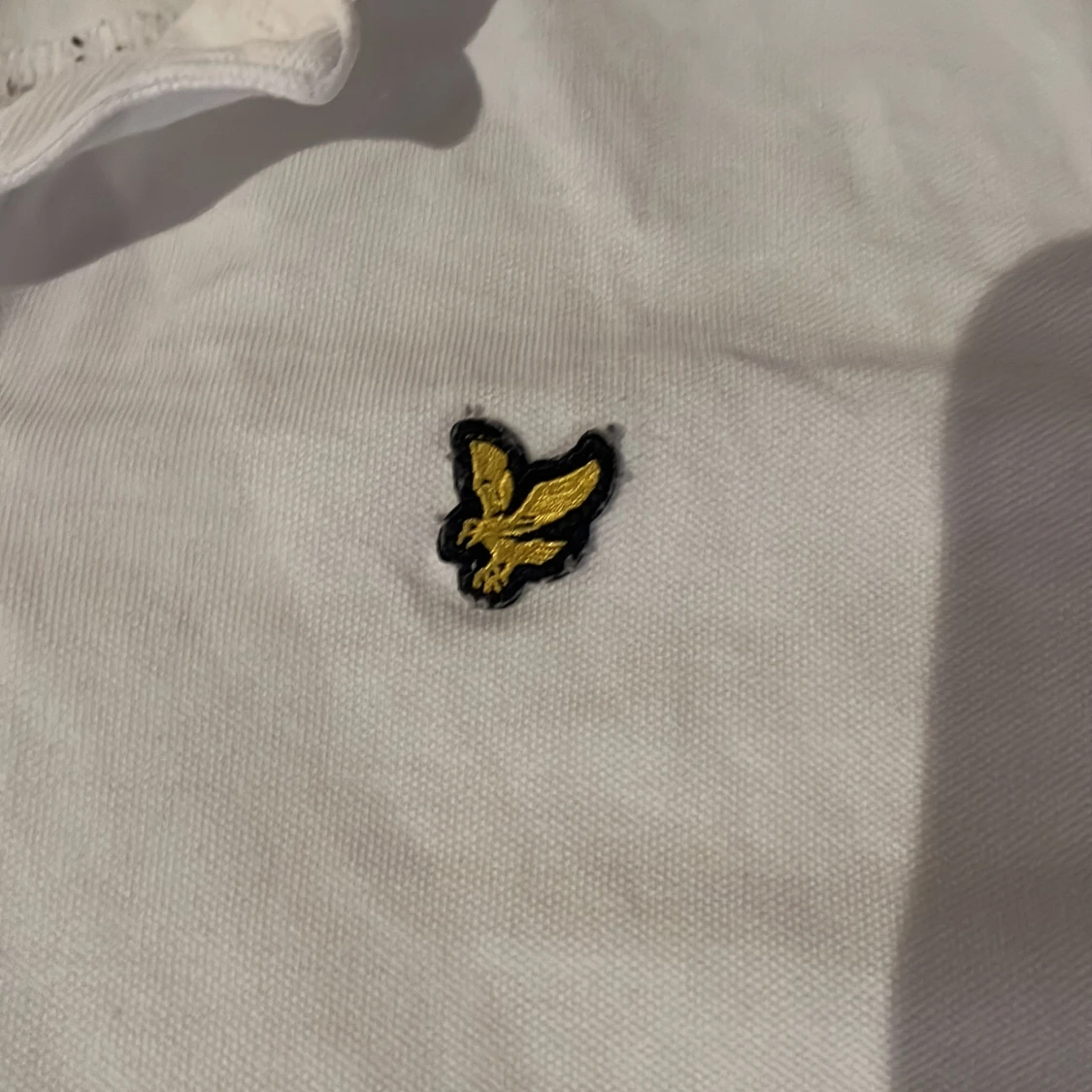 Säljer en klassisk vit pikétröja från Lyle & Scott med korta ärmar och broderad logga på bröstet. Perfekt för en stilren look.