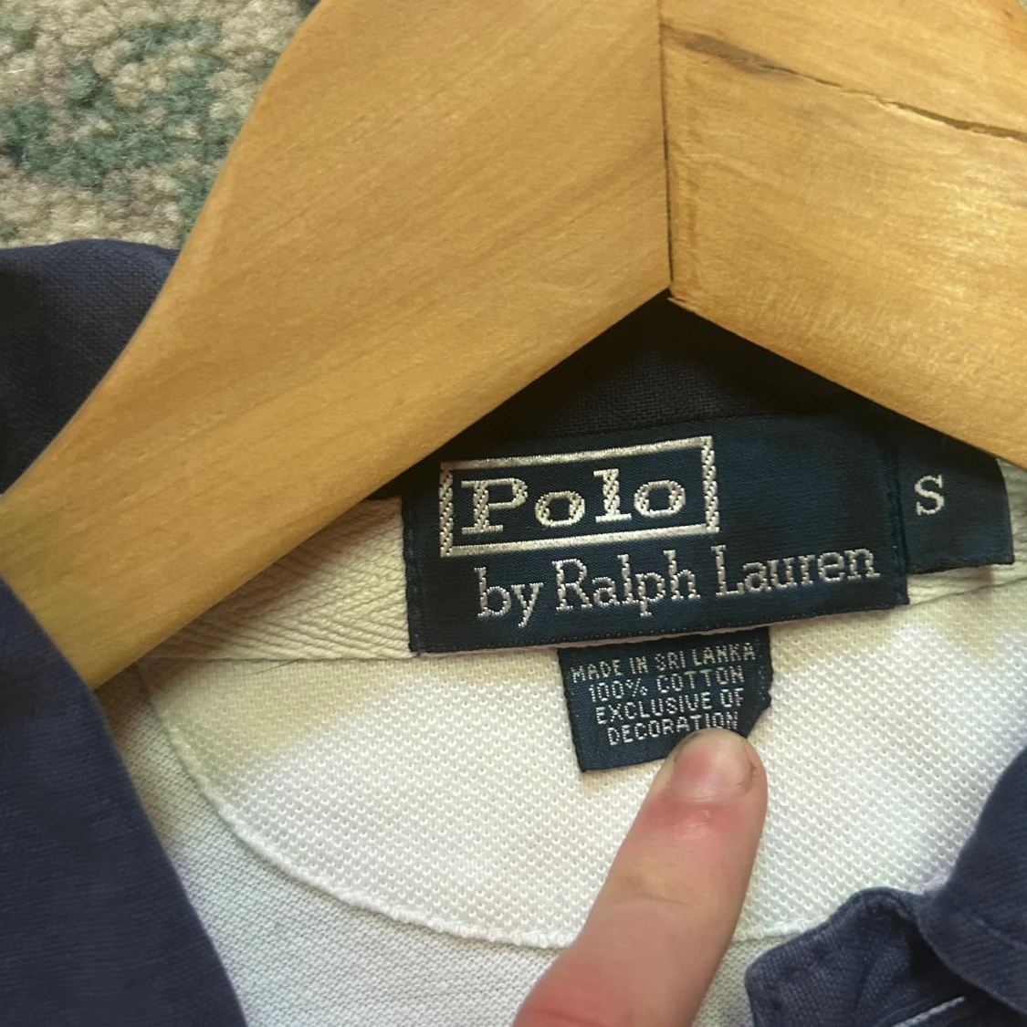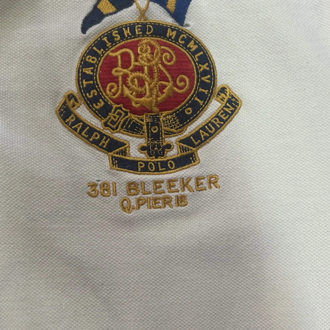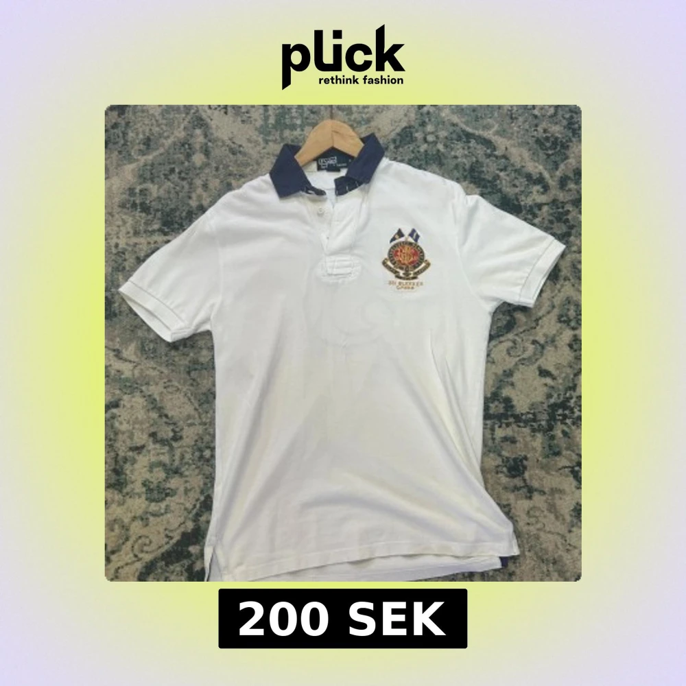Vit pikétröja från Polo Ralph Lauren i 100% bomull. Klassisk modell med mörkblå krage, broderad logga och emblem på bröstet samt stor siffra 5 på ryggen. Snygg och sportig stil med korta ärmar och knappar vid halsen.
