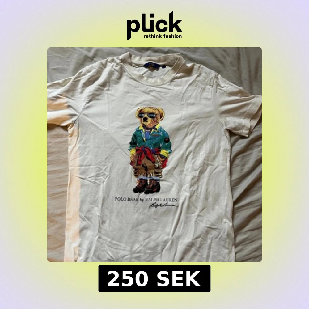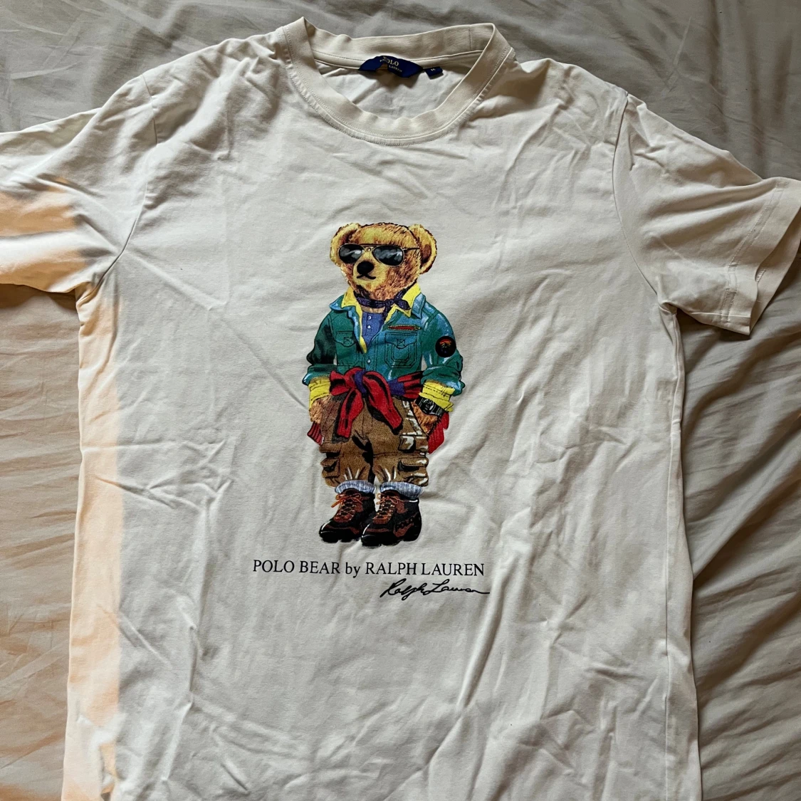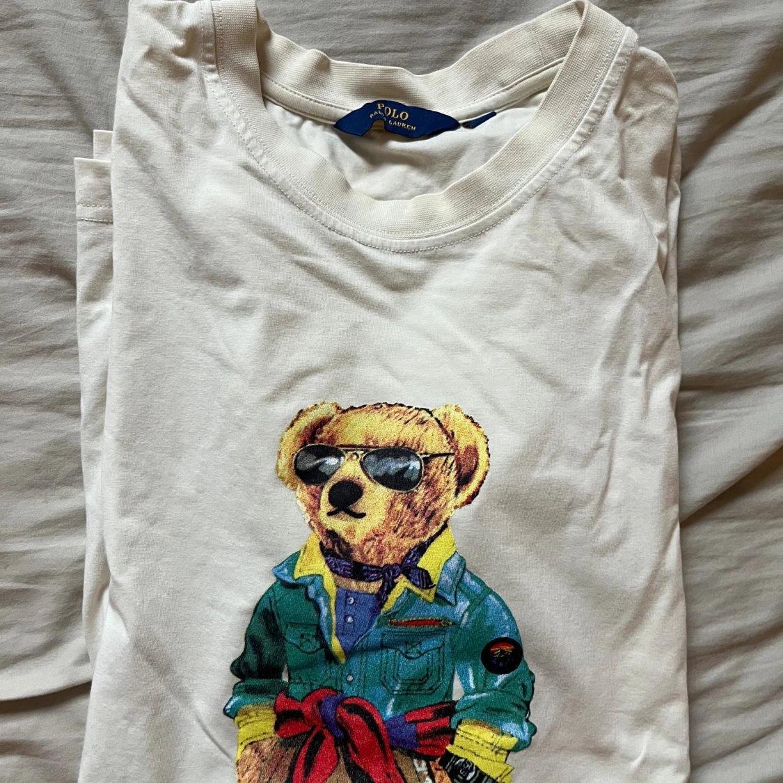 Vit t-shirt från Ralph Lauren med ikoniskt Polo Bear-tryck framtill. Björnen har coola solglasögon och färgglada kläder.