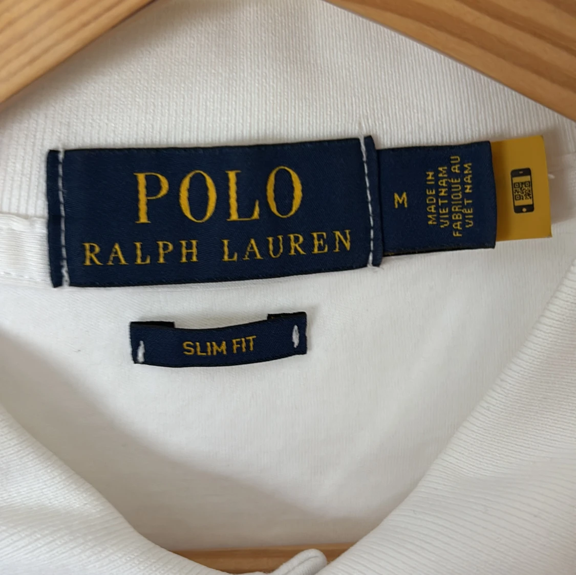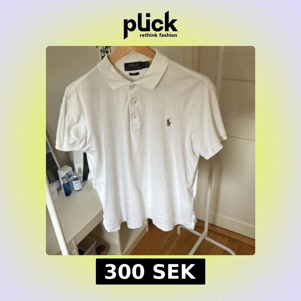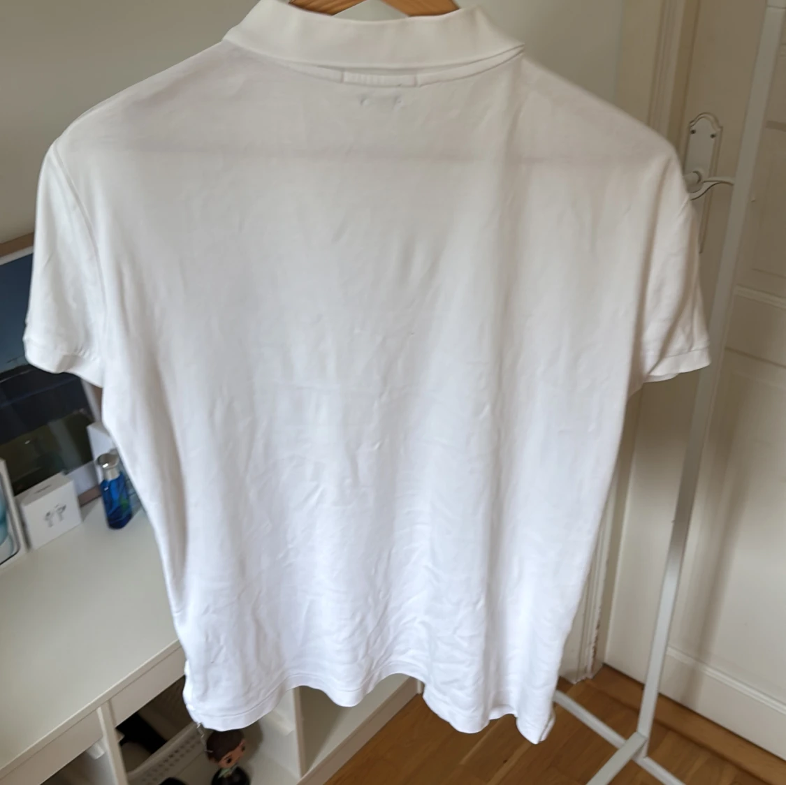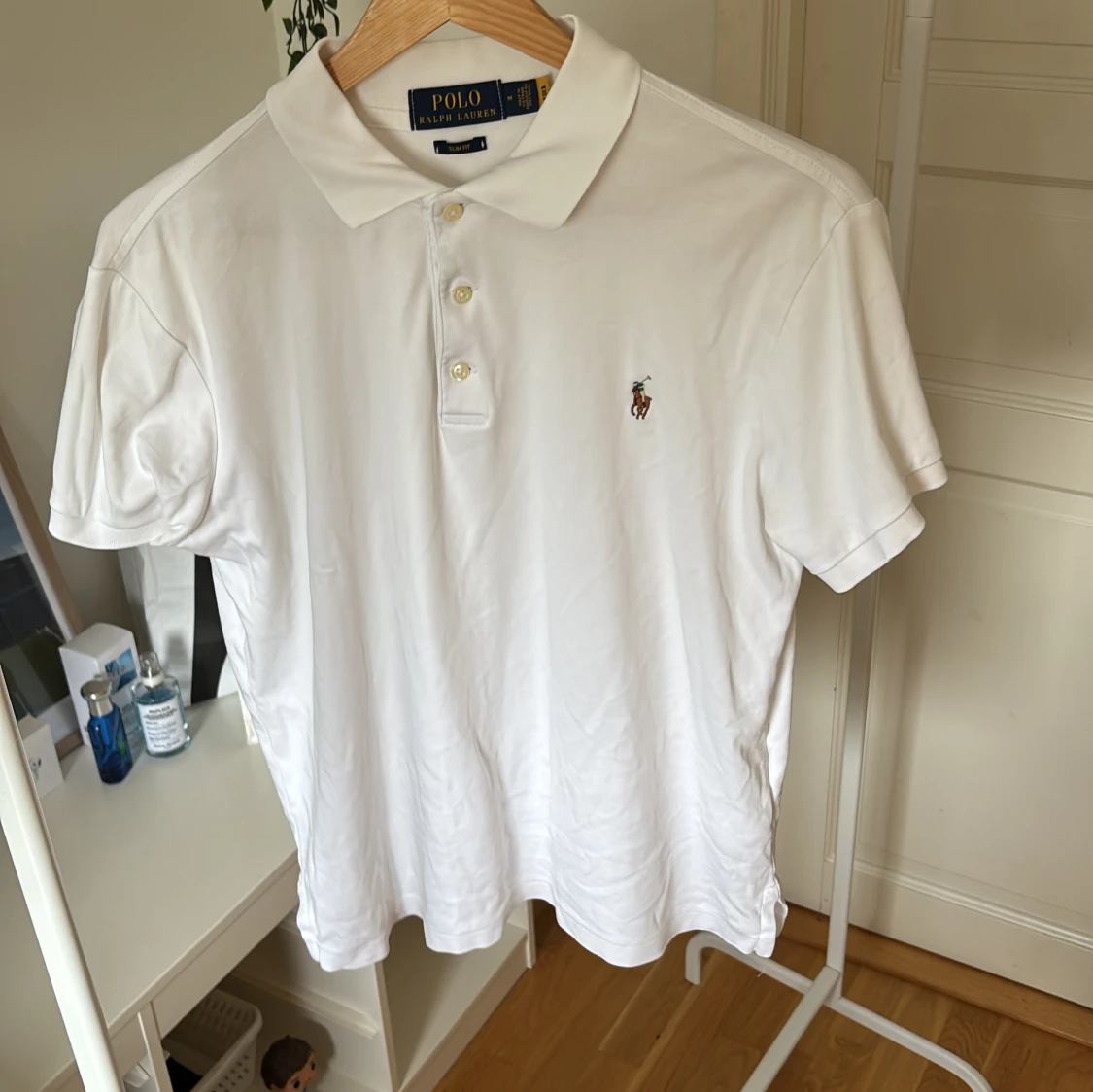 Vit t-shirt från Polo Ralph Lauren i slim fit med klassisk krage och tre knappar framtill. Ikonisk broderad logga med polospelare på bröstet. Tillverkad i mjuk bomull, perfekt för en clean och stilren look. Storlek medium herr. Ny pris ca 1500kr