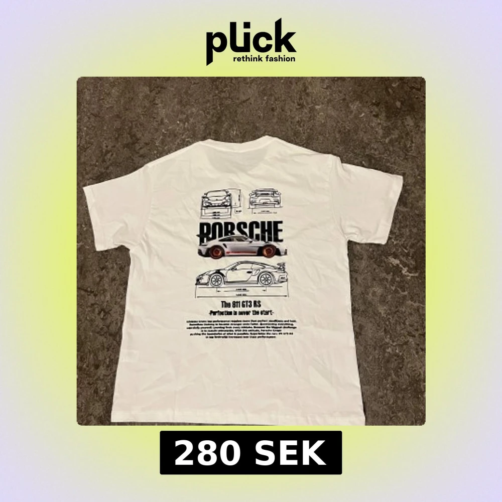 Vit t-shirt med stor Porsche 911 GT3 RS-illustration och text på ryggen. Trycket visar olika vyer av bilen och har svarta och röda detaljer. Framsidan är helt vit utan tryck. Perfekt för bilentusiasten!