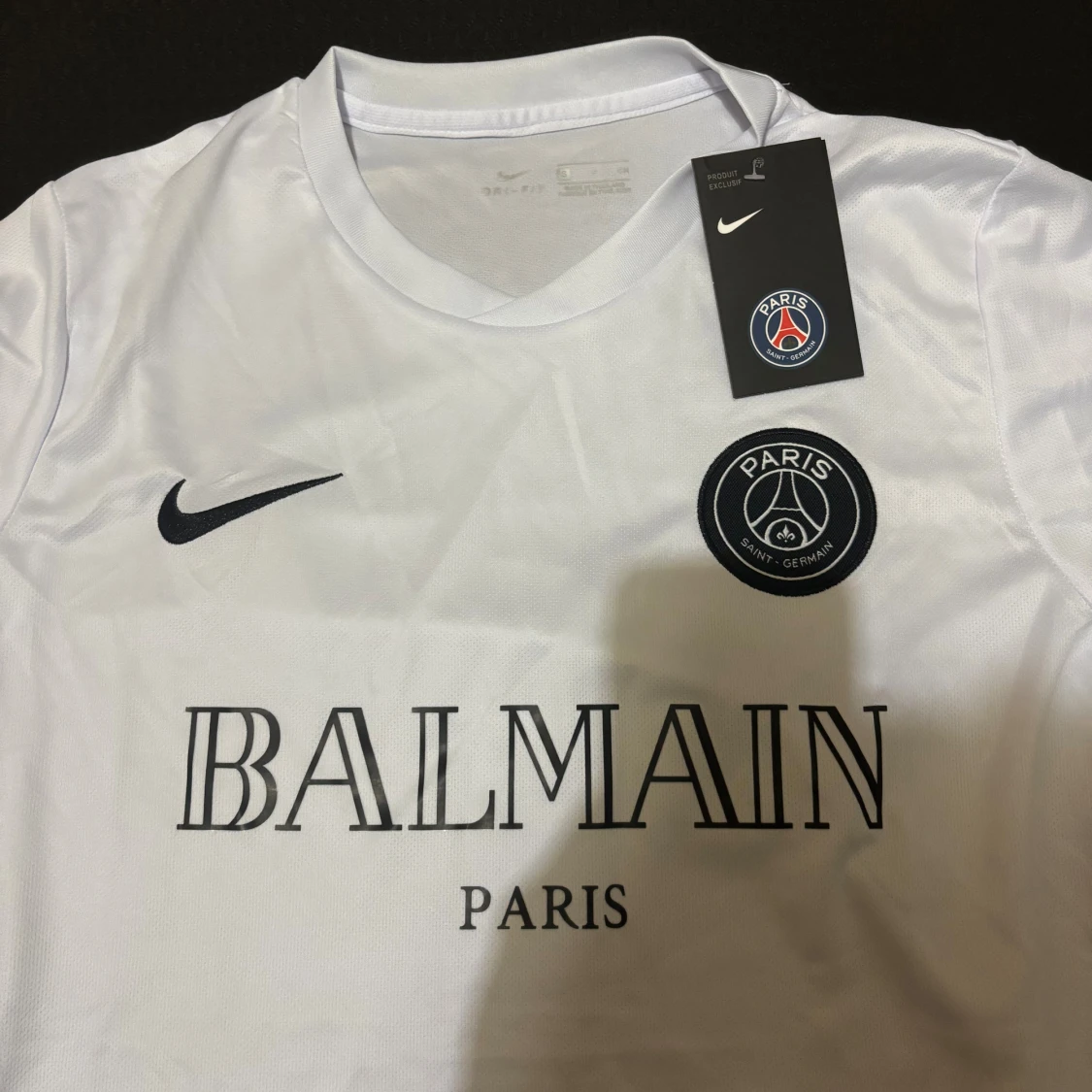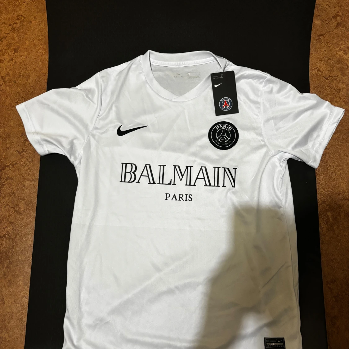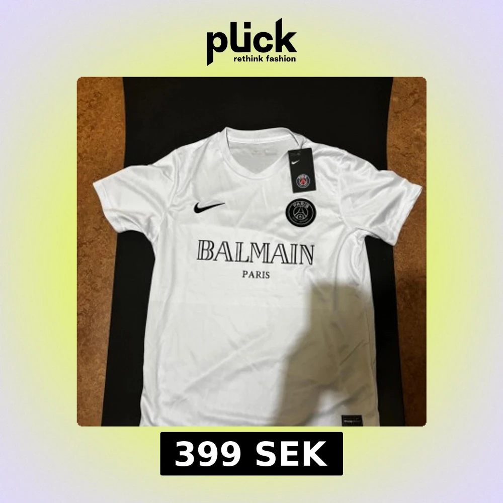 Snygg vit fotbollströja från Nike i samarbete med PSG och Balmain. Tröjan har korta ärmar, rund halsringning och svart PSG-logga samt Balmain Paris-tryck på bröstet. Tillverkad i lätt och glansigt funktionsmaterial som andas.