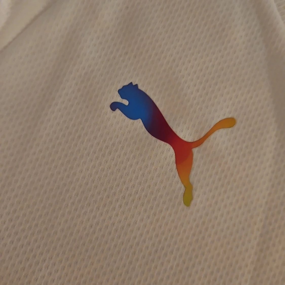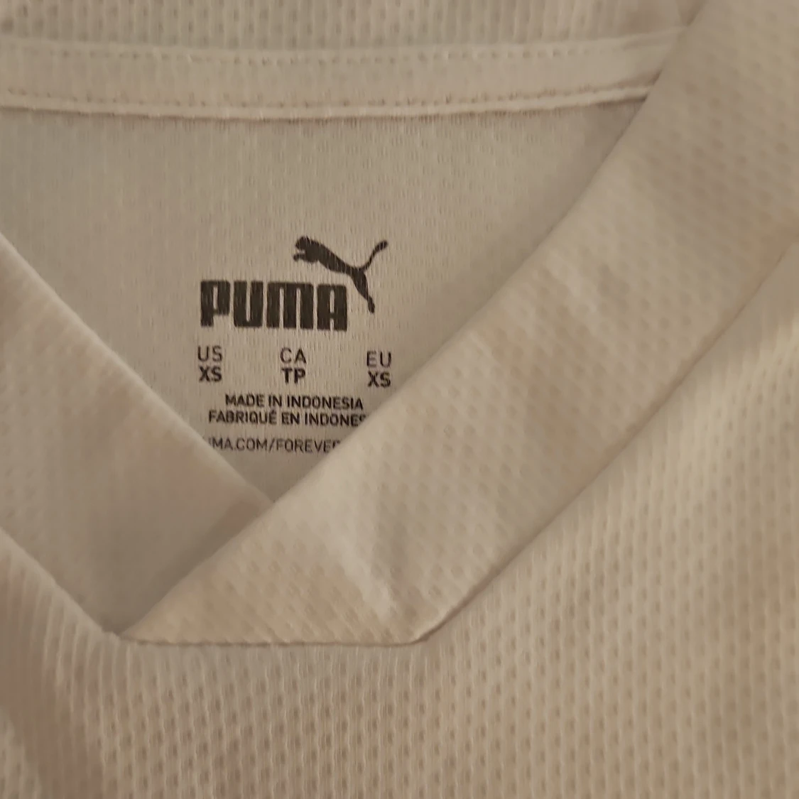 Snygg vit fotbollströja från Puma i storlek XS. Tröjan har korta ärmar med blå detaljer på axlarna och ett färgglatt Puma-logo på bröstet. Materialet är lätt och andas, perfekt för träning eller match. DryCell-teknologi för att hålla dig torr.